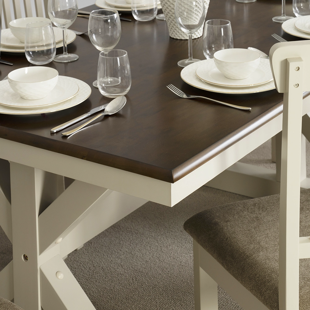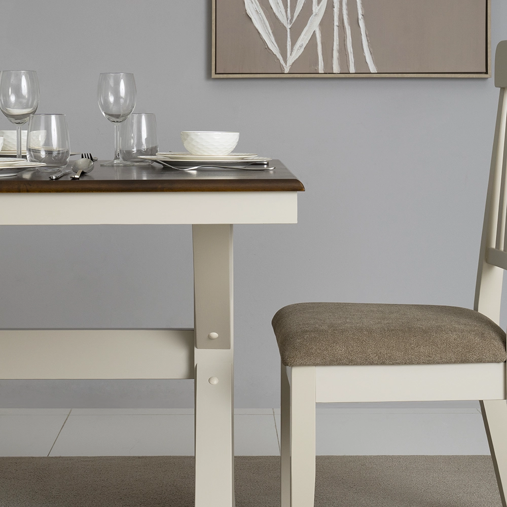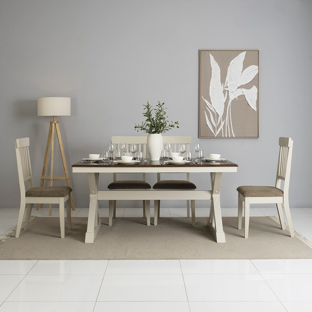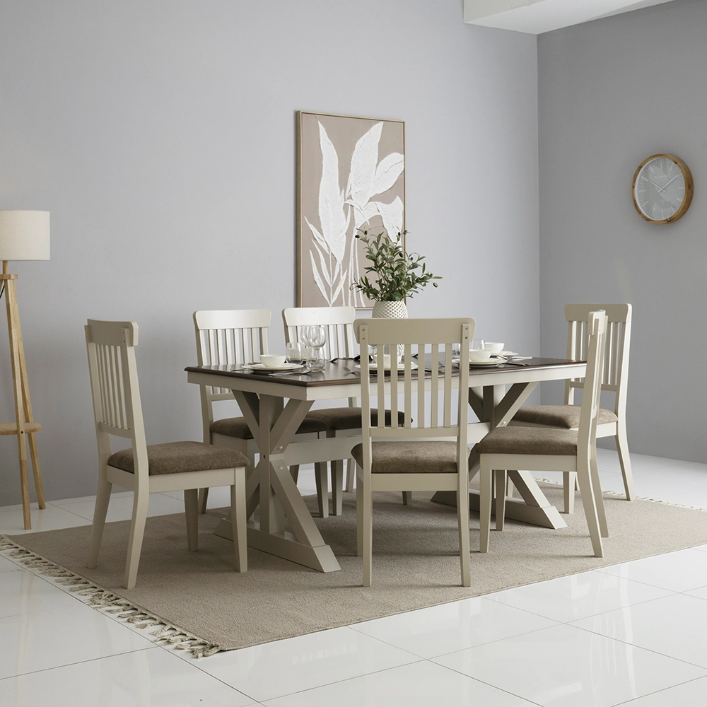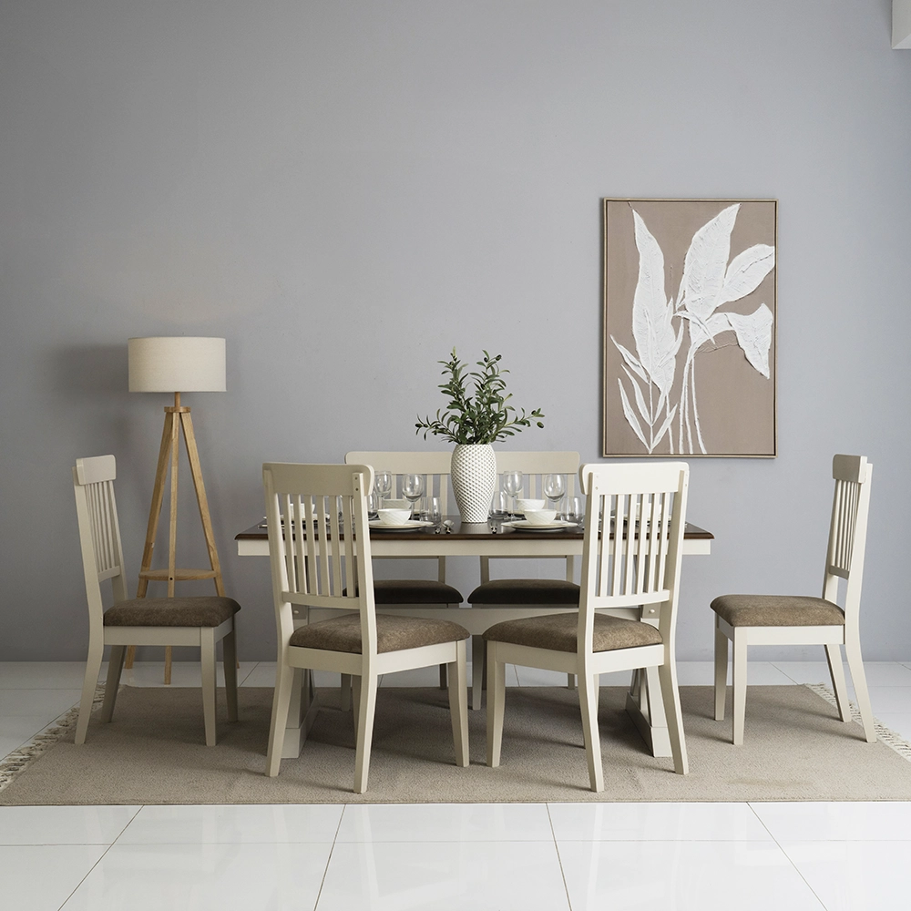 The Alex dining set 6 seater – oak & off-white features an MDF table top with veneer lamination, a sturdy rubberwood frame, and fabric upholstered chairs, blending durability with modern style for a comfortable dining experience.
