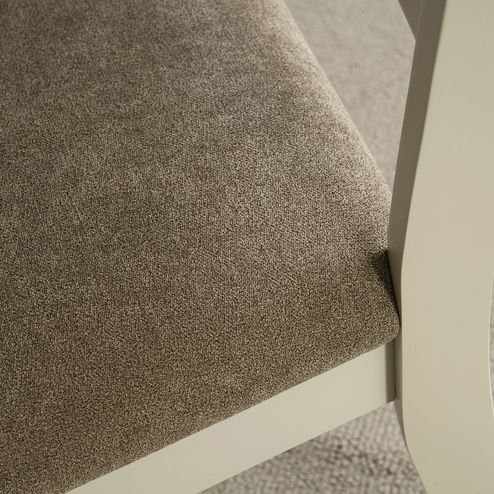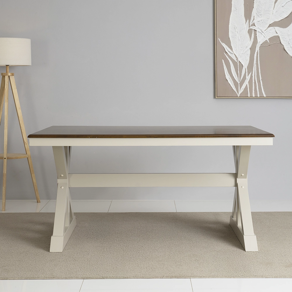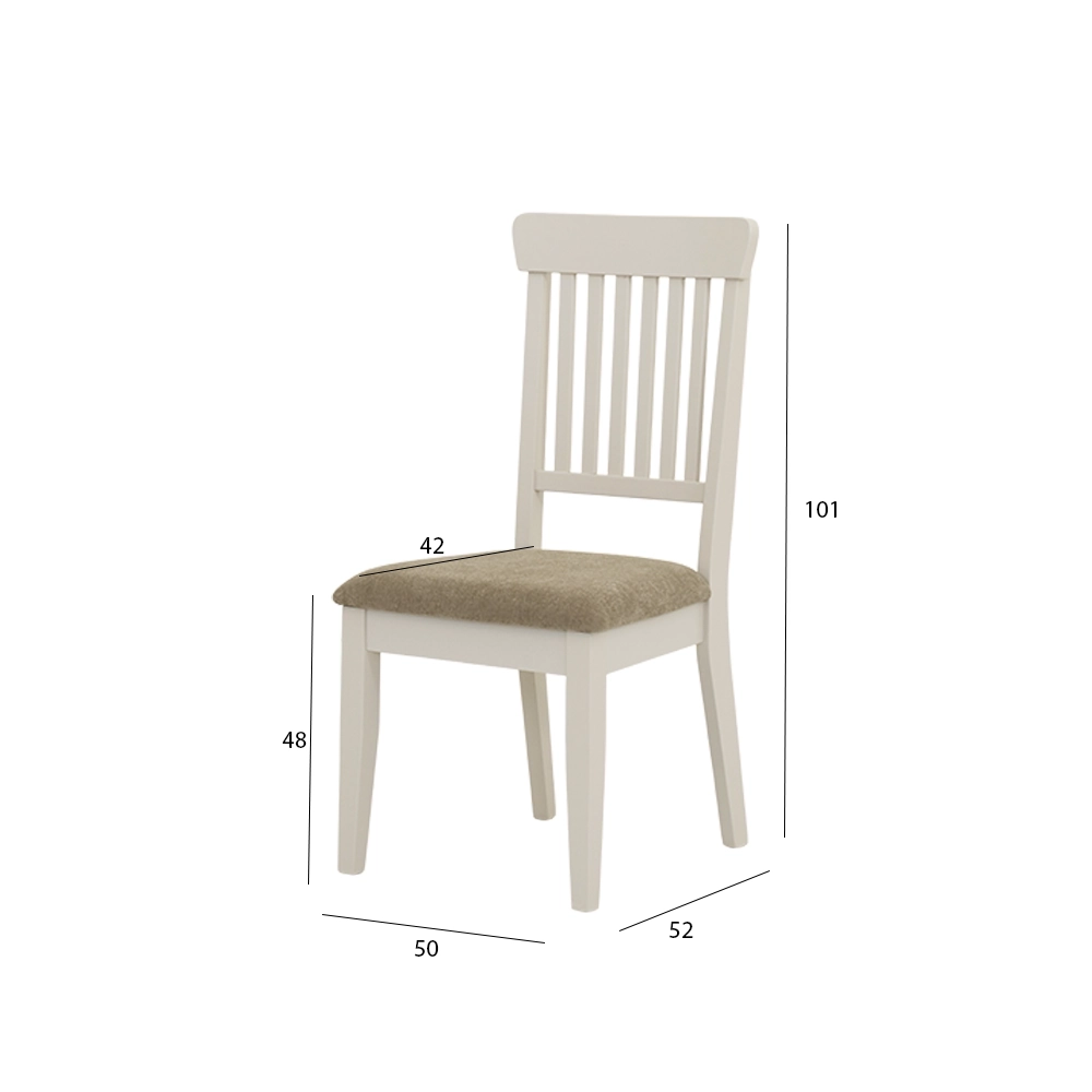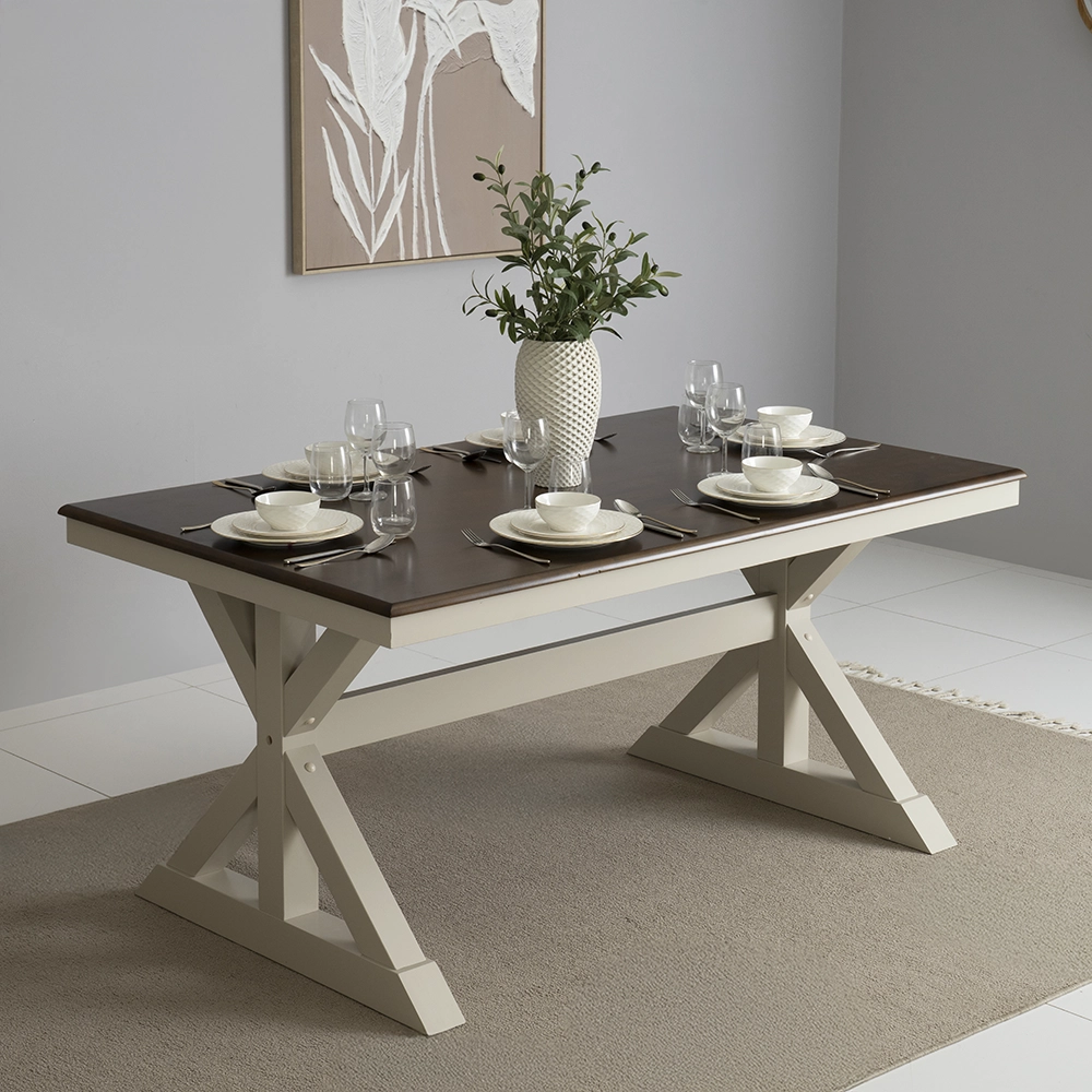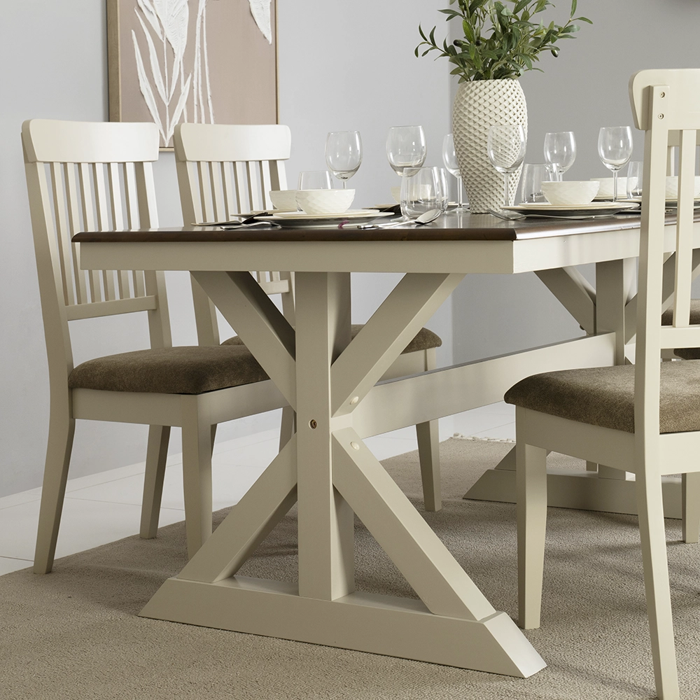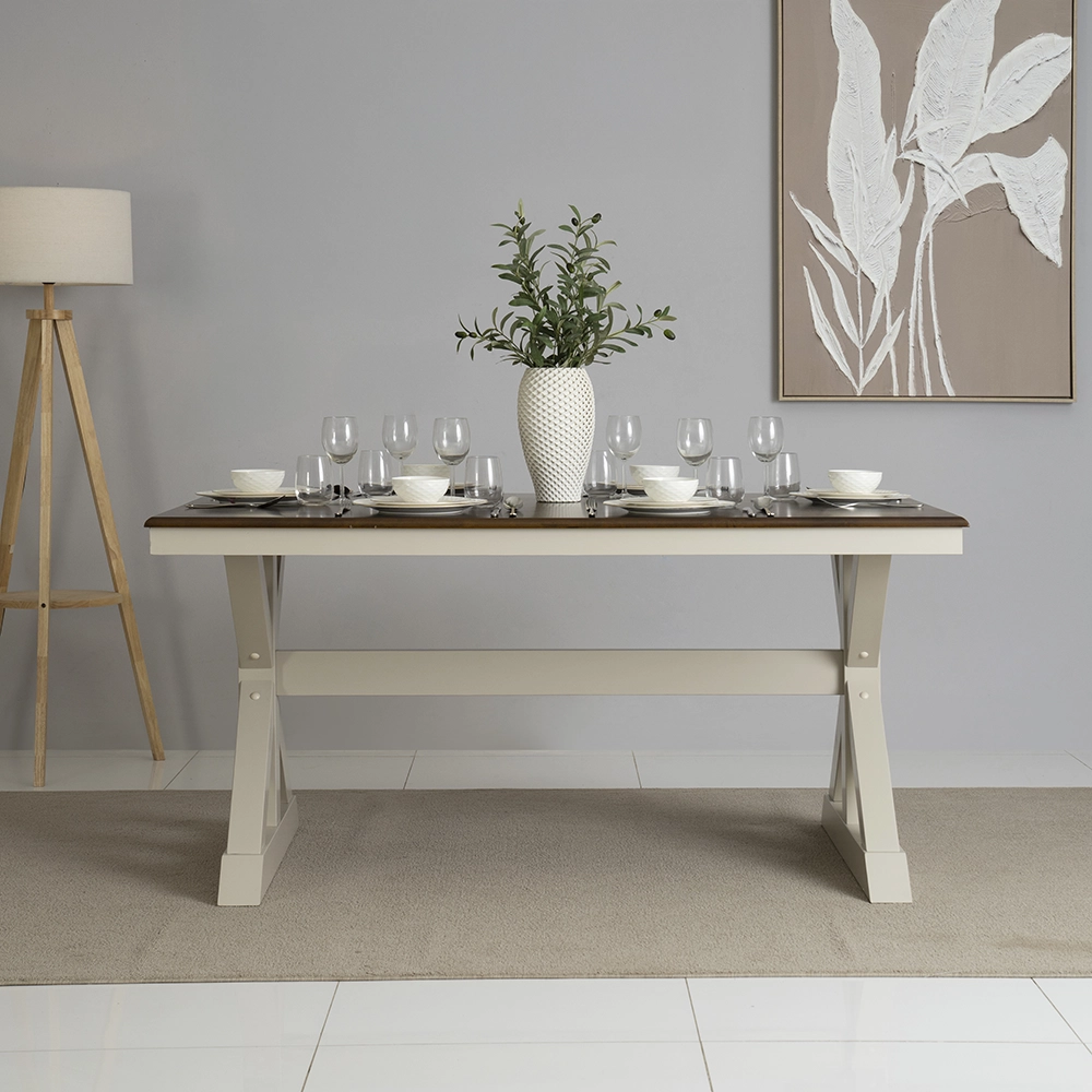 The Alex dining set 6 seater – oak & off-white features an MDF table top with veneer lamination, a sturdy rubberwood frame, and fabric upholstered chairs, blending durability with modern style for a comfortable dining experience.