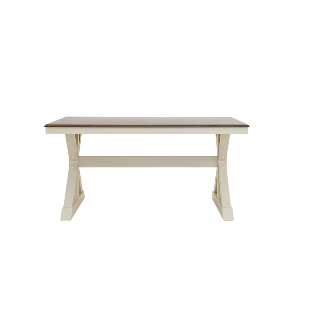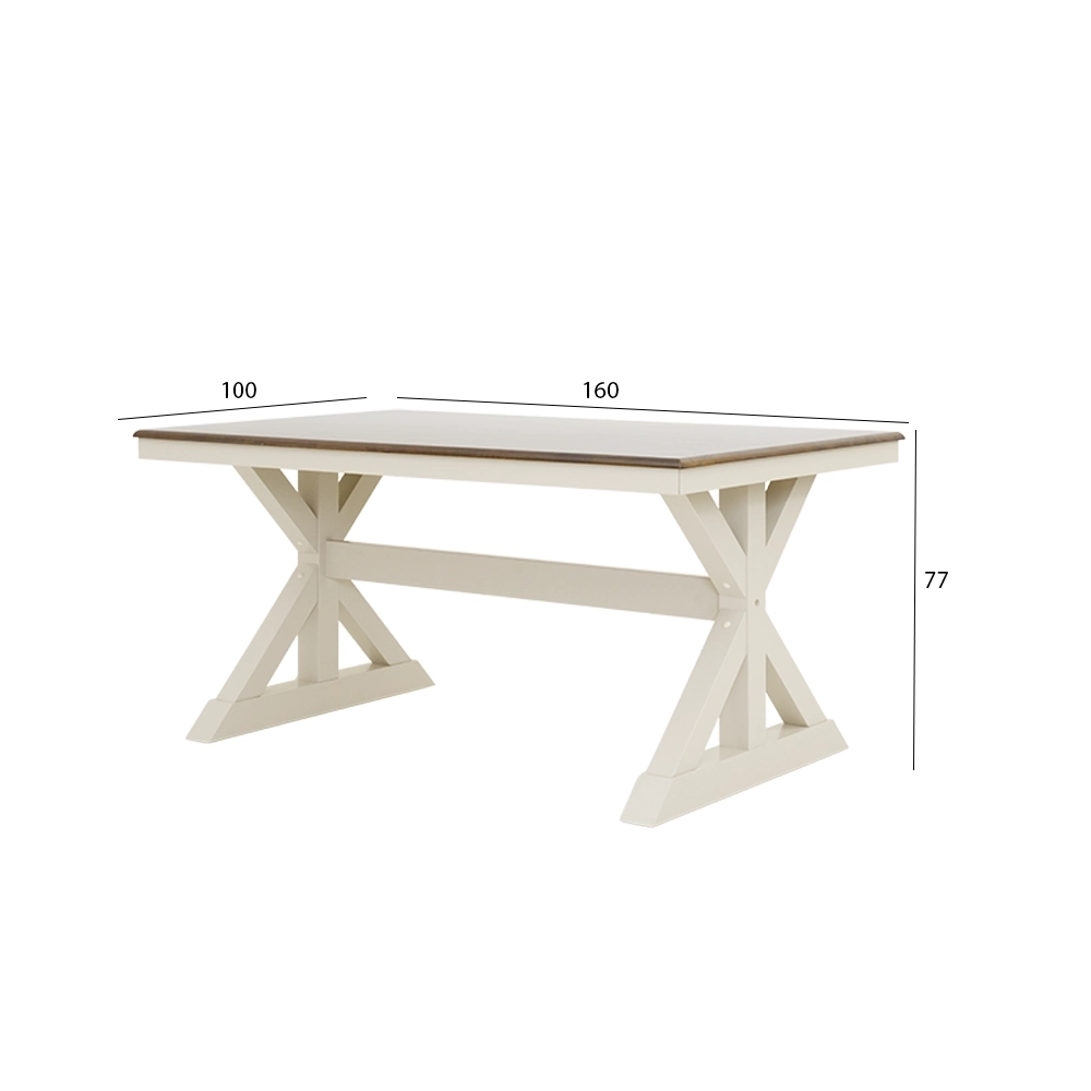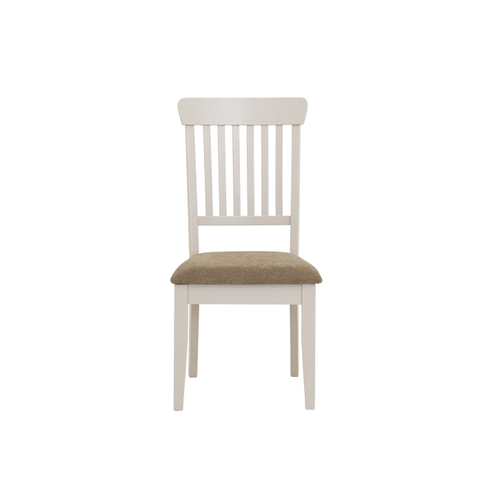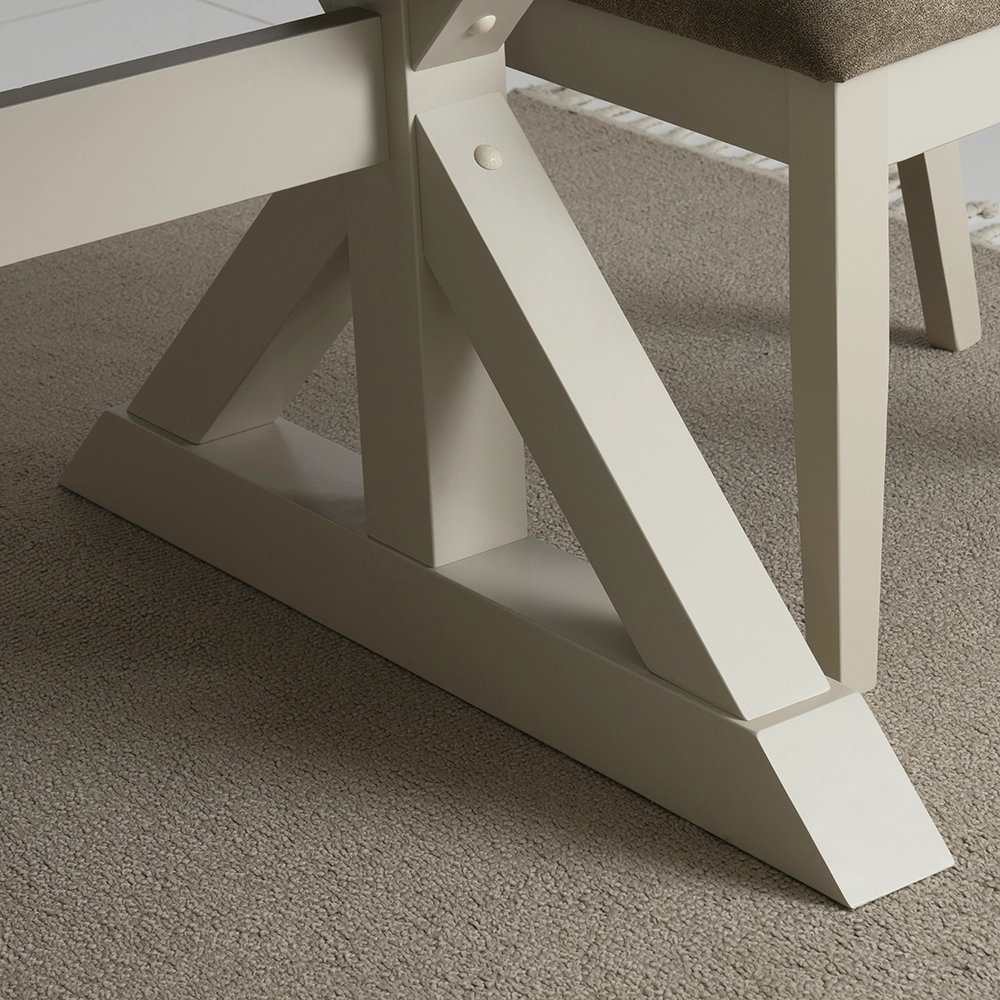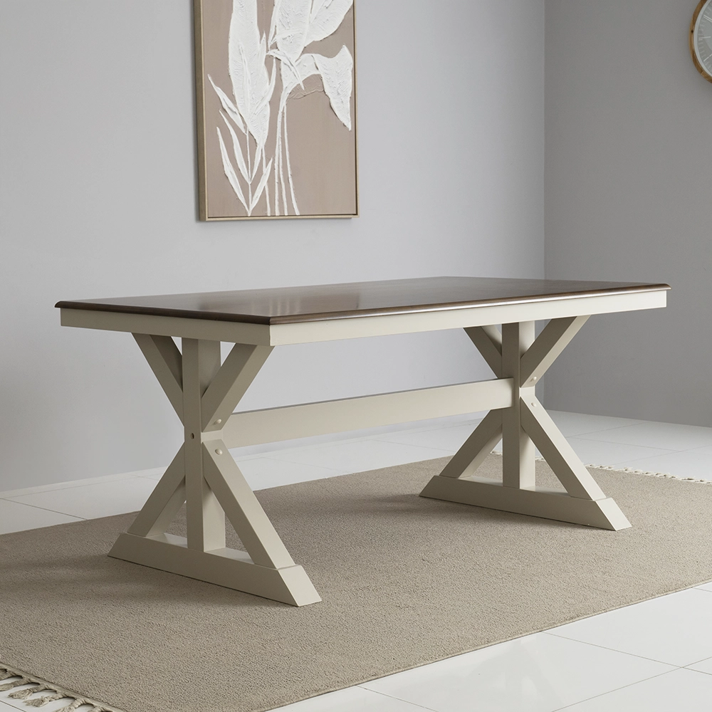 The Alex dining set 6 seater – oak & off-white features an MDF table top with veneer lamination, a sturdy rubberwood frame, and fabric upholstered chairs, blending durability with modern style for a comfortable dining experience.