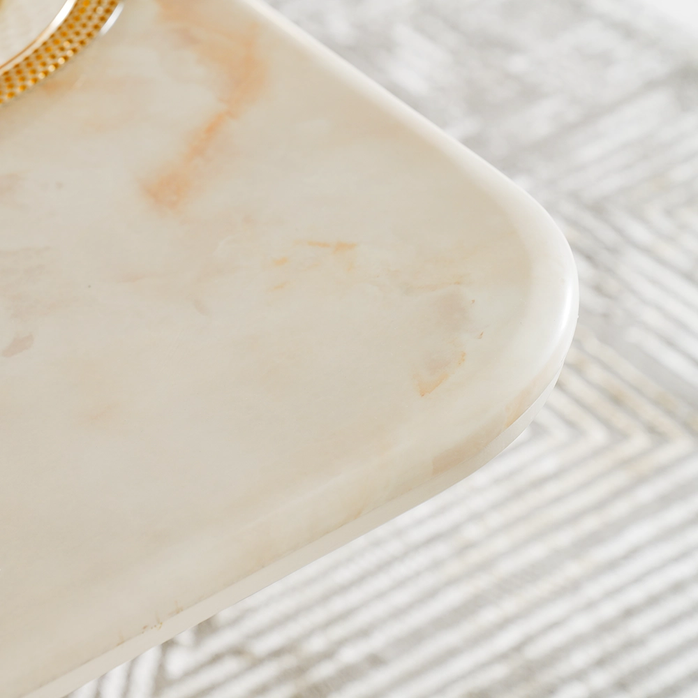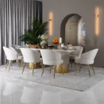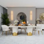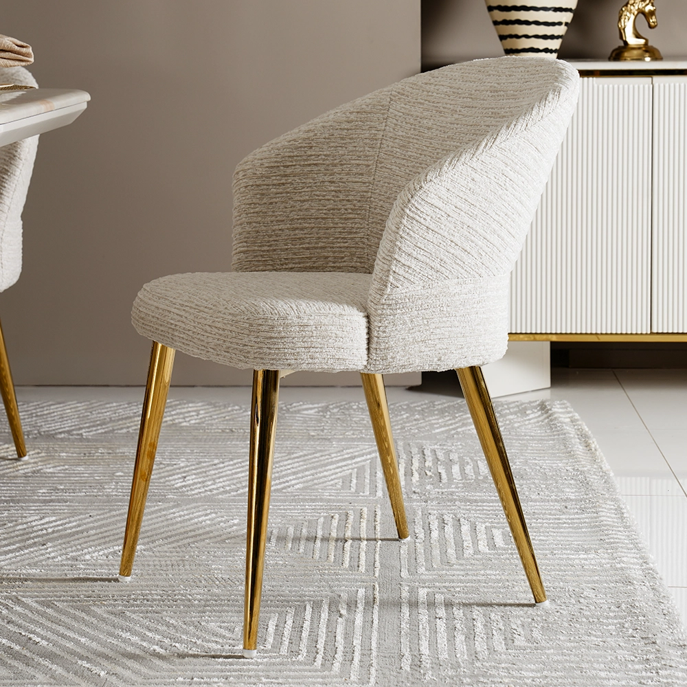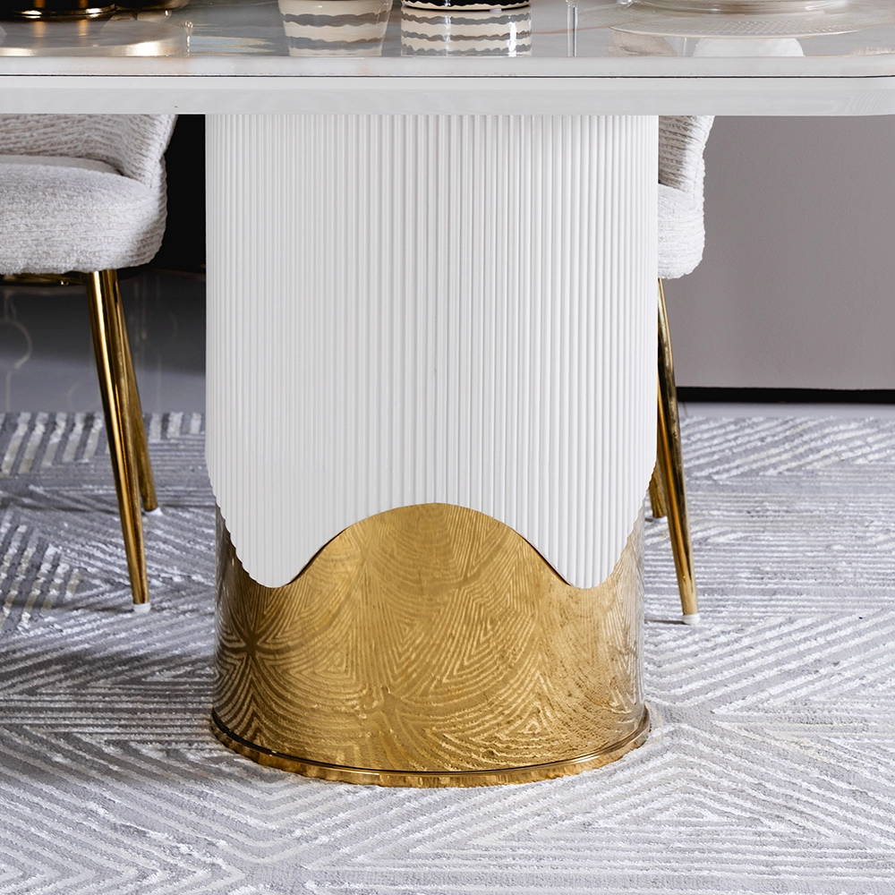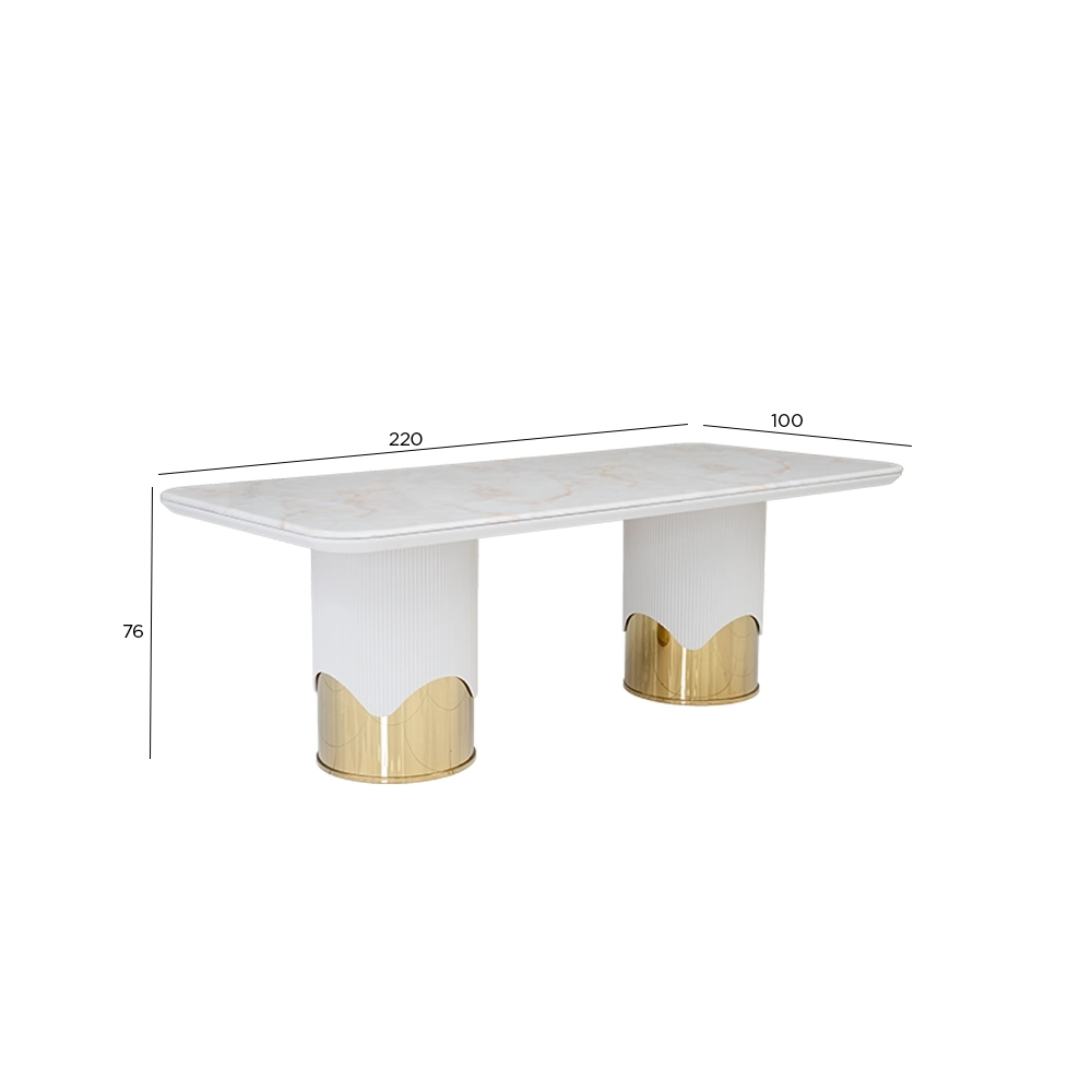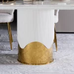 Finished with a sleek glossy finish, the set is highlighted in a timeless Off white and gold color palette, adding a sense of brightness and refinement to your home. The spacious table provides ample room for meals and gatherings, while the upholstered faux leather chairs ensure comfort and style for your guests.