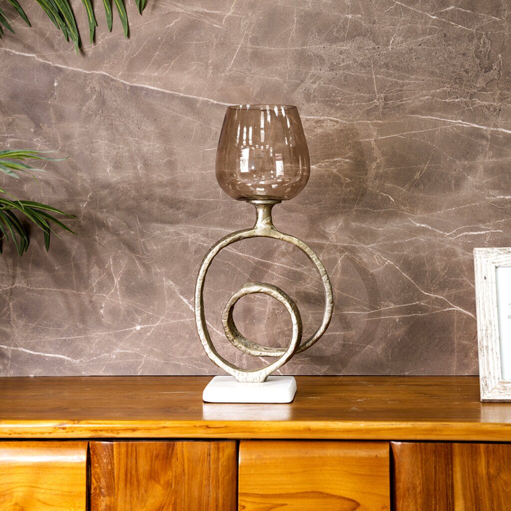 Meet the Aurum Candle Holder, a beautiful decor piece crafted from a combination of aluminum, glass, and marble. This unique blend of materials creates a stylish and durable design.