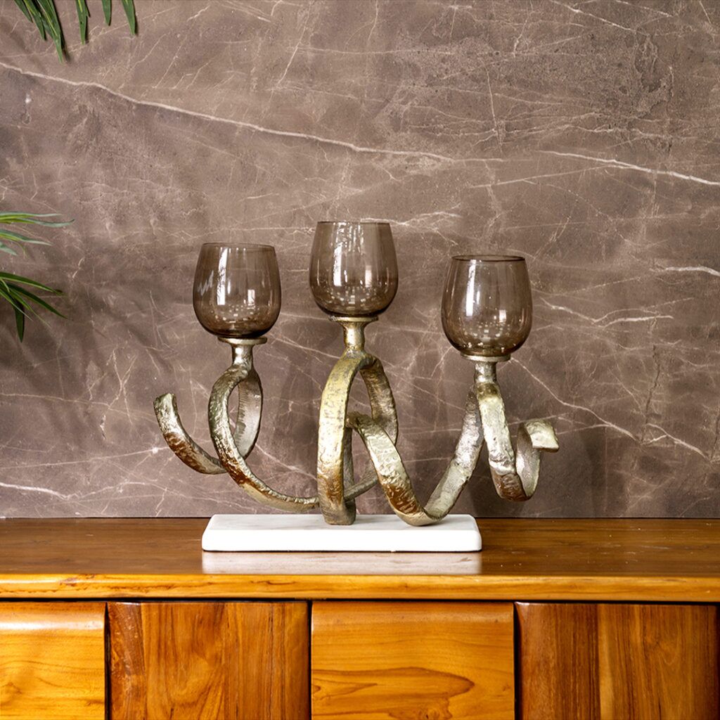 The Aurum Metal Swirl Candle Holder blends luxury and elegance with its aluminum swirl design, glass, and marble, adding a sophisticated touch to any space.