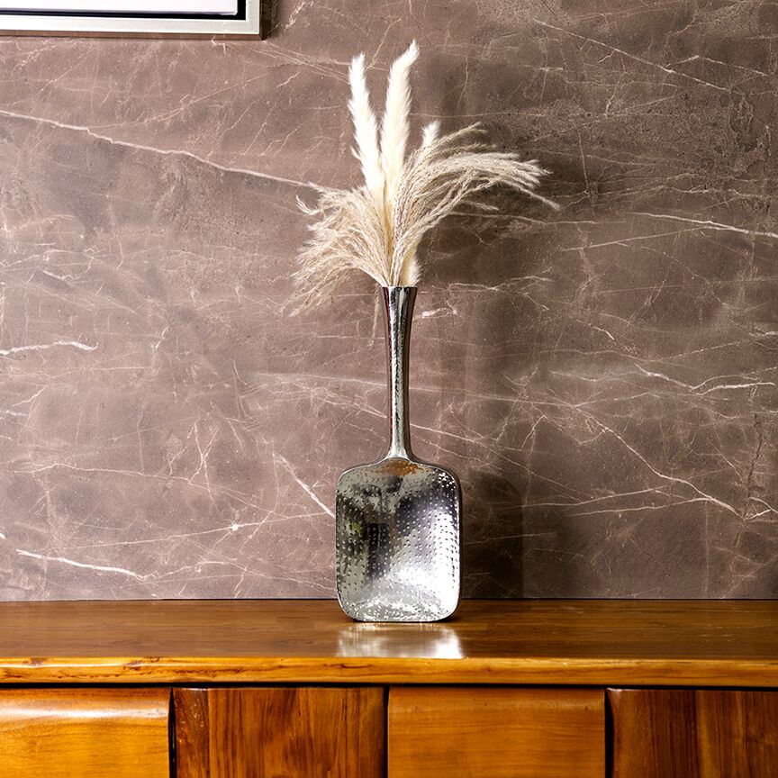 The Aurum Vase Decor is a sophisticated and stylish piece made from high-quality aluminum, featuring a sleek nickel finish. Its modern design combines clean lines and a minimalist aesthetic, making it a versatile addition to any interior décor.