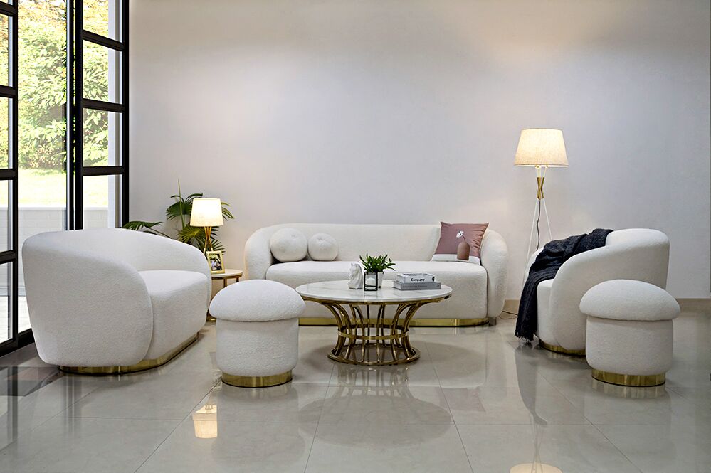 Introducing the breathtaking Ava sofa set with ottoman, Each piece is expertly upholstered in sumptuous, boucle fabric that not only caresses your senses but also radiates an aura of refinement.