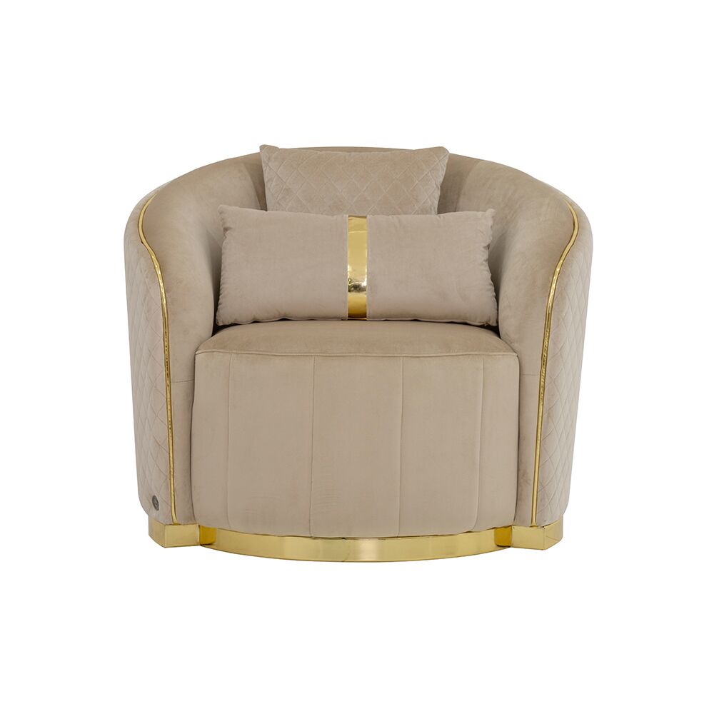 Introducing the Bianca Arm Chair, showcasing an elegant blend of style and sophistication. Adorned with wooden gold-plated legs and distinguished by a round arm style, this chair seamlessly merges luxurious design with timeless appeal.