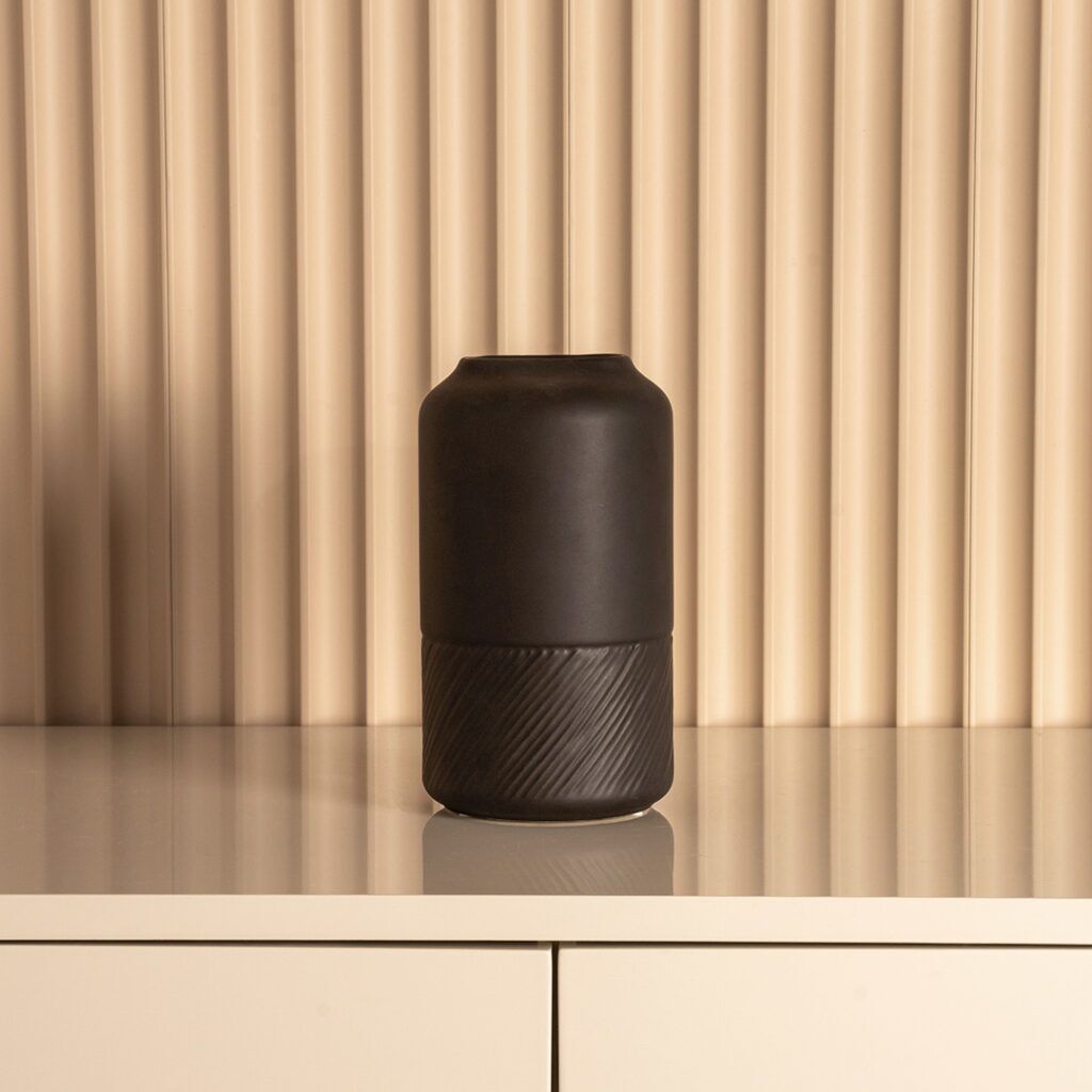 The blenka ceramic black vase features a classic design with a sleek black finish, adding timeless elegance and sophistication to any space.