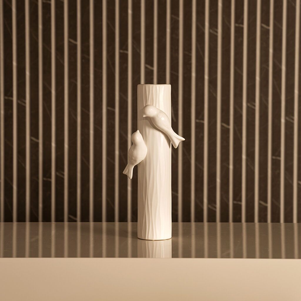 The Blenka Ceramic White Bird Vase features an elegant bird-inspired design with a smooth white finish, adding a touch of charm and sophistication to any space.