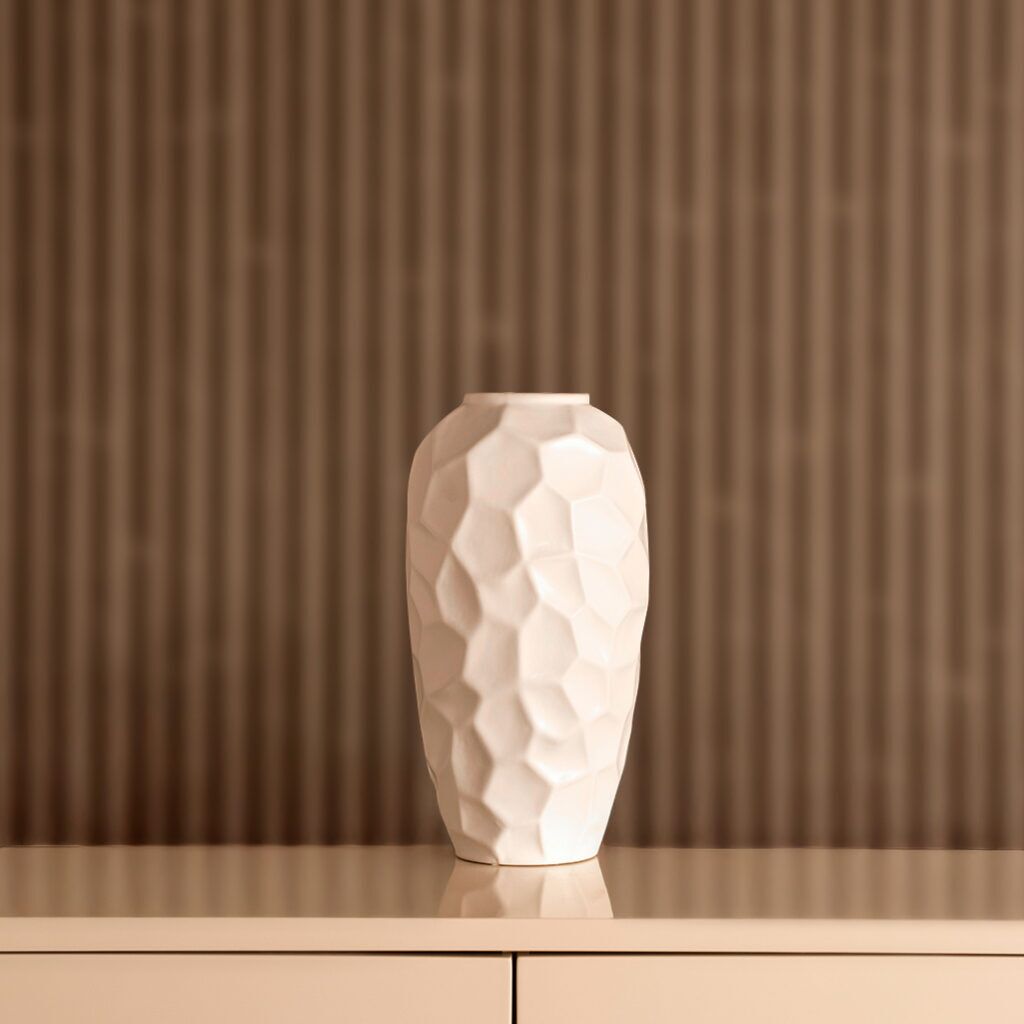 The Blenka Ceramic White Vase features a sleek design with a smooth white finish, adding timeless elegance to any space.