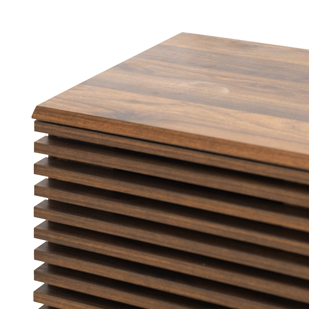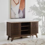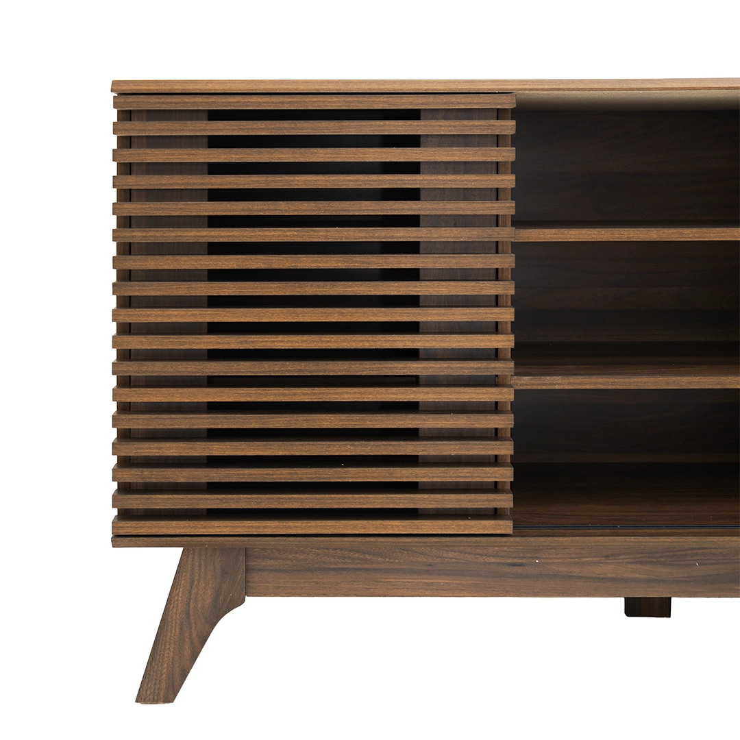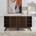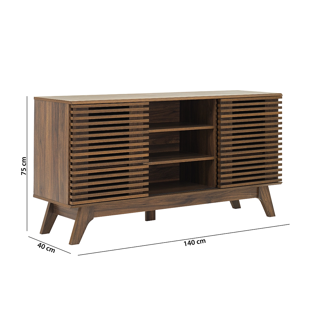 This sideboard, in a rich walnut color, is designed with thoughtful storage features and slide doors, making it an exceptional addition to elevate your living space with both style and practicality.