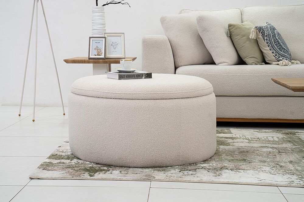 Introducing the Circle O Ottoman with Storage, a versatile and stylish addition to your living space. Crafted with premium fabric upholstery, this ottoman combines comfort with practicality.