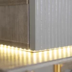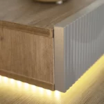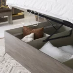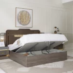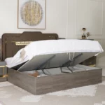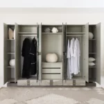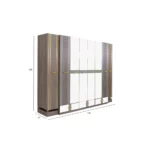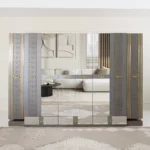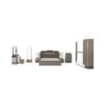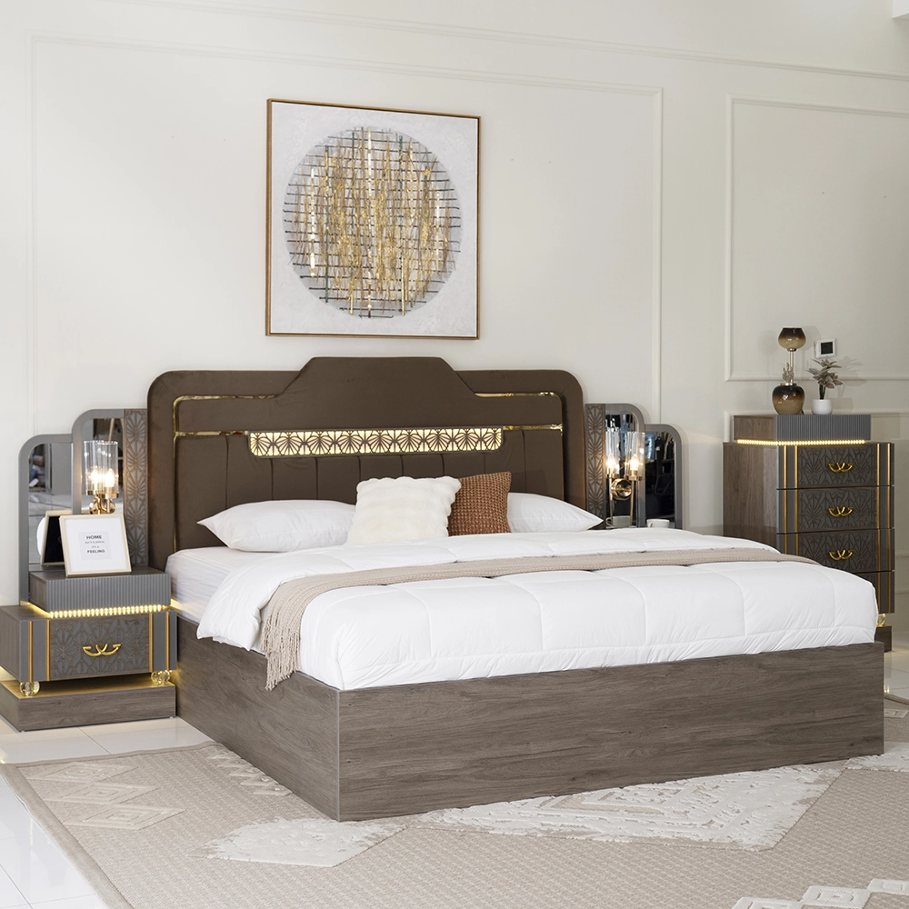 A modern, space-smart set featuring a 200×200 cm bed, generous 8-door wardrobe, chest of drawers, bench, and long mirror—all in an elegant brown and grey finish for a cohesive, contemporary look.