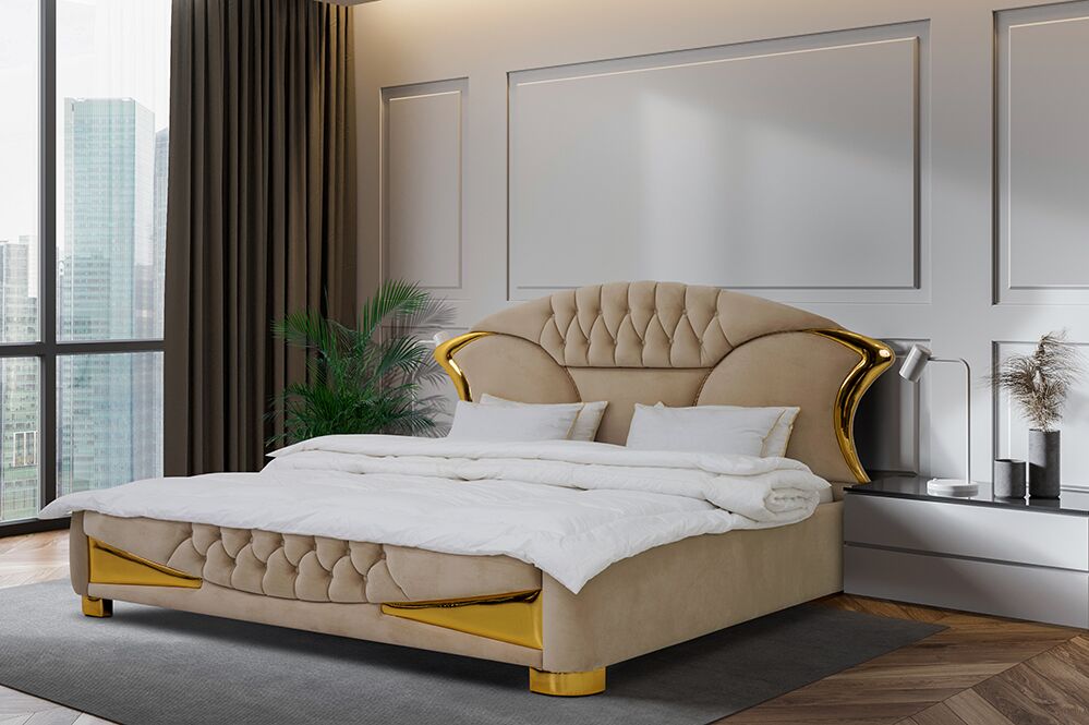 Elevate your bedroom with this luxurious bed, where modern design seamlessly meets the opulence of gold-plated legs.