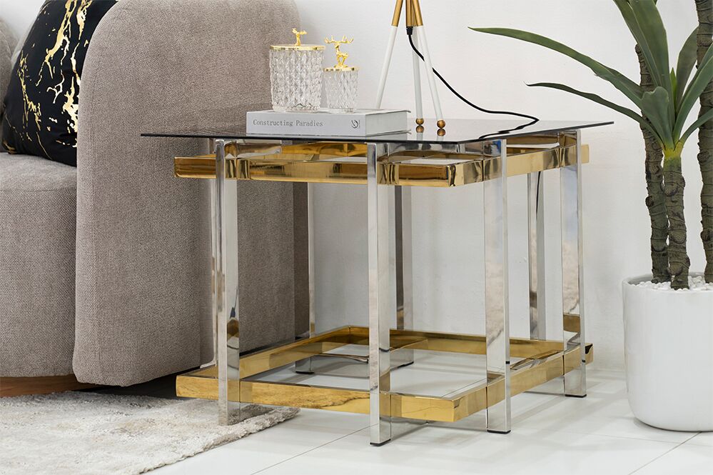 The interplay of gold and silver colors on the stainless-steel frame of the Dalgona End Table creates a captivating contrast, adding a touch of glamour to any living space.