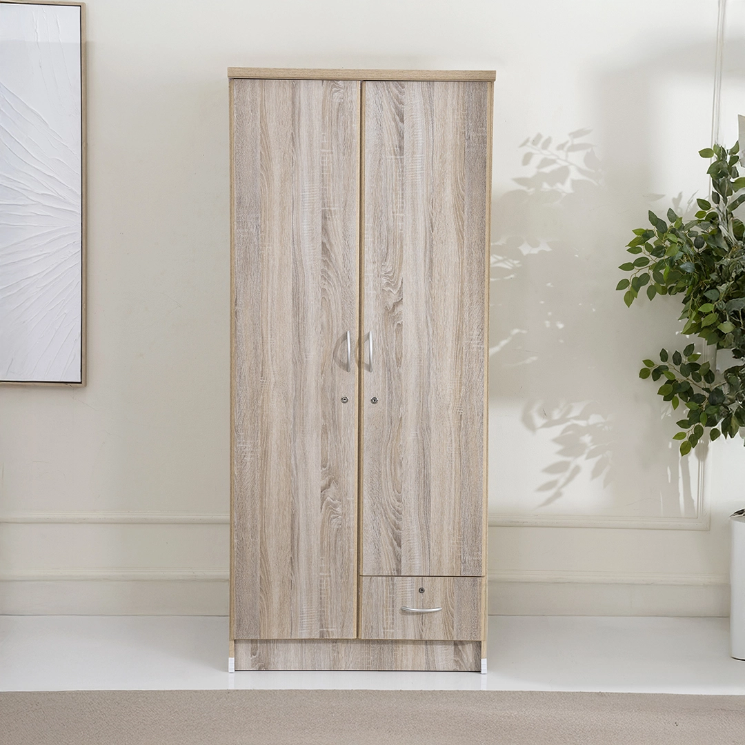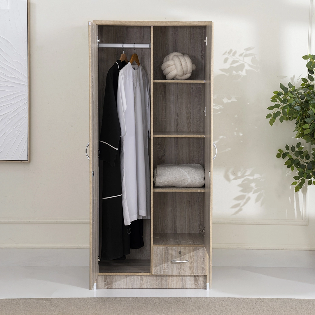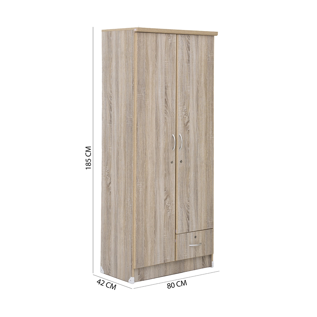 The DONNI is a 2-door wardrobe finished in a Sonoma Oak colour — a light, natural oak shade that blends easily with modern or contemporary bedroom décor. It offers a practical solution for organizing clothing while saving space.