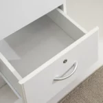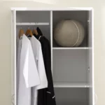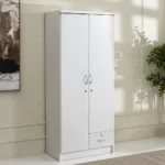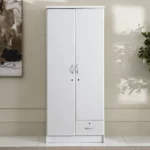 The DONNI is a 2-door wardrobe finished in a Walnut color — shade that blends easily with modern or contemporary bedroom décor. It offers a practical solution for organizing clothing while saving space.