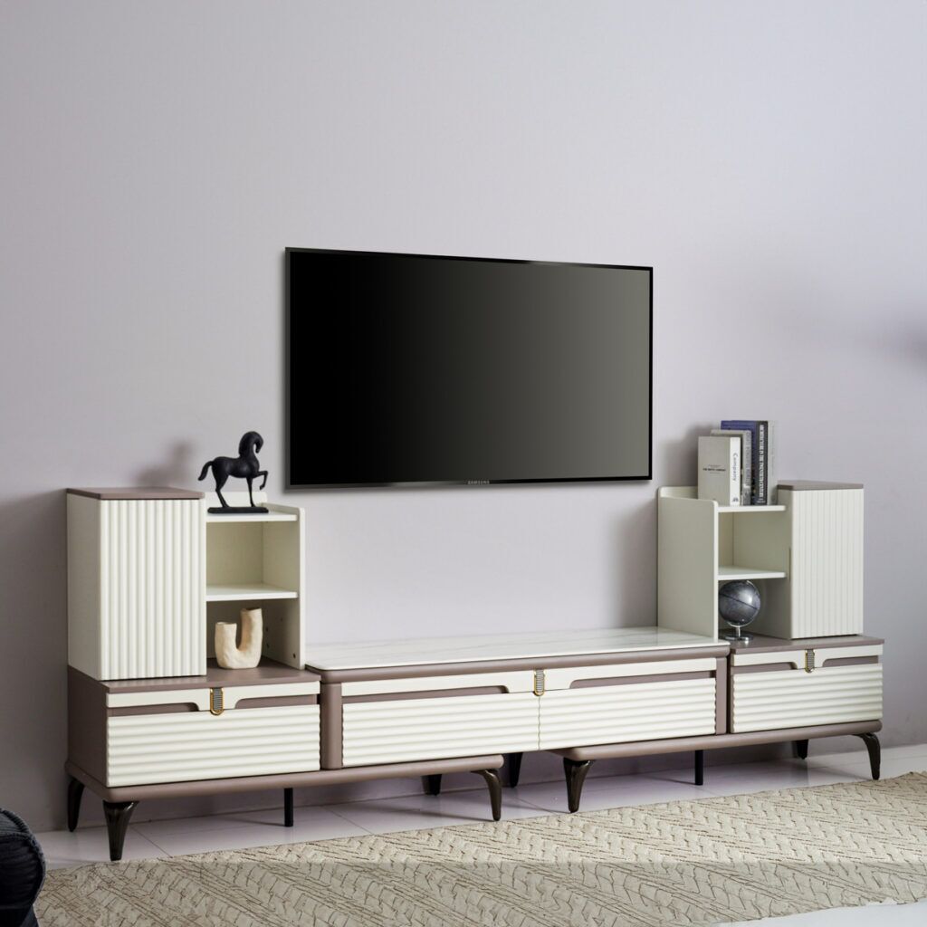 Modern and versatile, this sleek TV unit features smooth curved edges, ample storage, and an extendable design that easily adjusts in length—making it larger or smaller to perfectly fit your space.