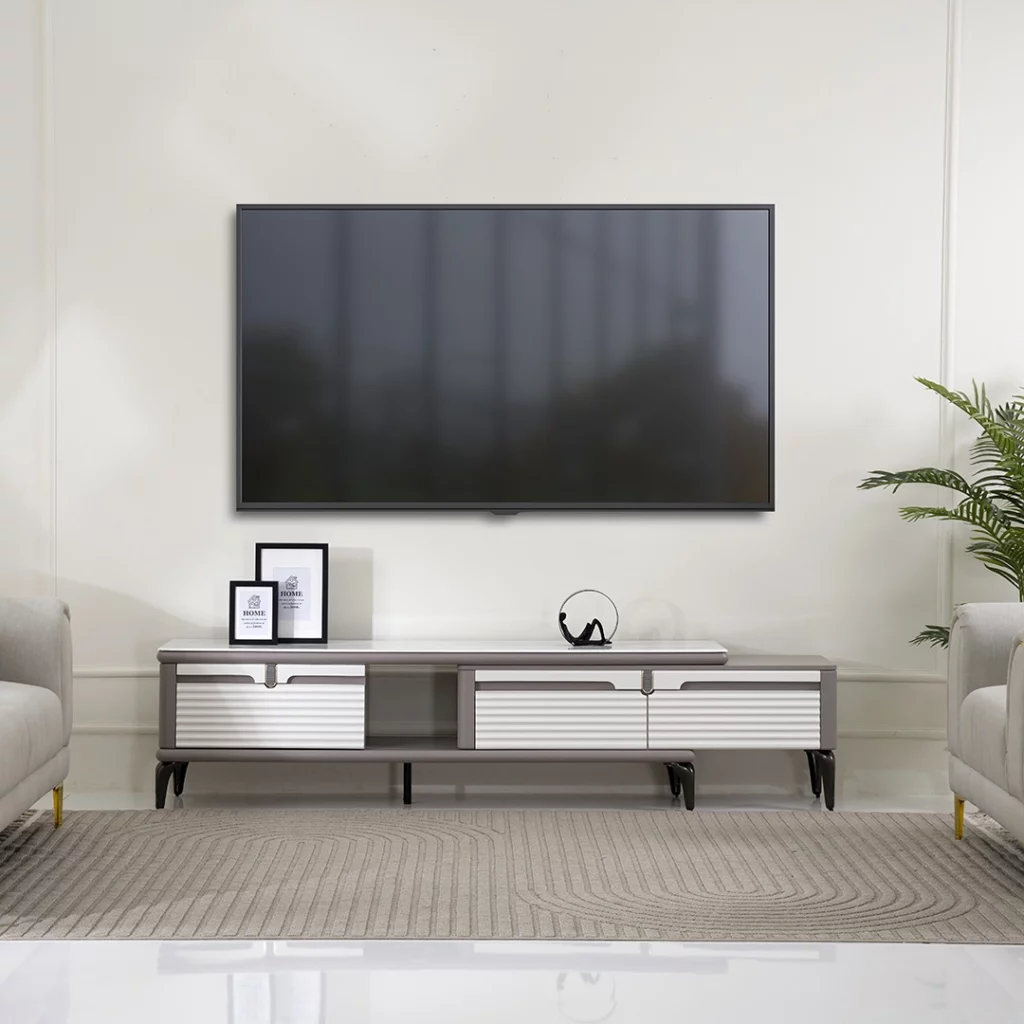 Modern and versatile, this sleek TV unit features smooth curved edges, ample storage, and an extendable design that easily adjusts in length—making it larger or smaller to perfectly fit your space.