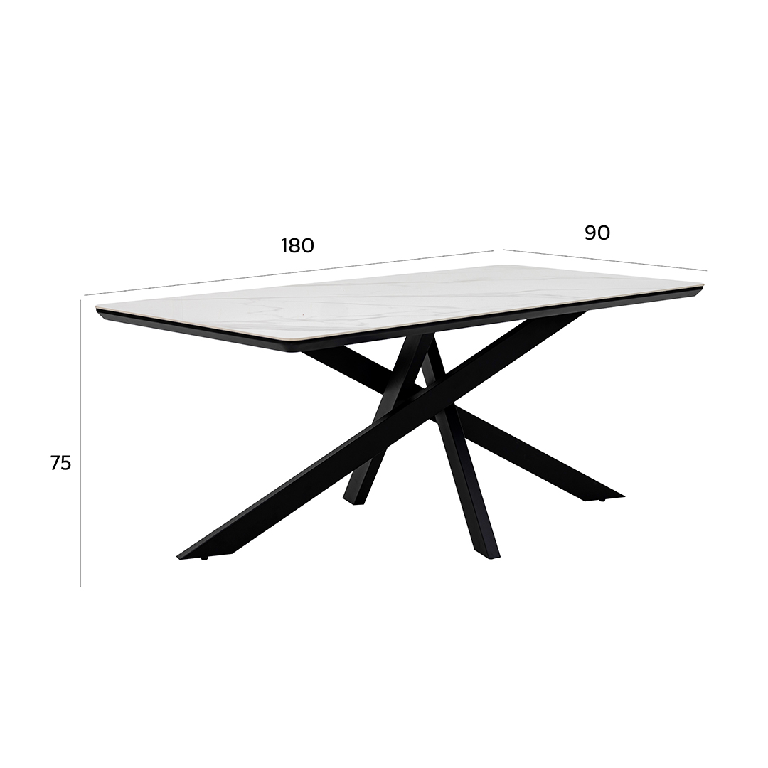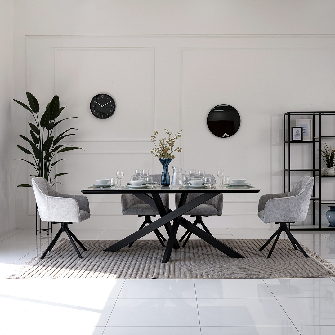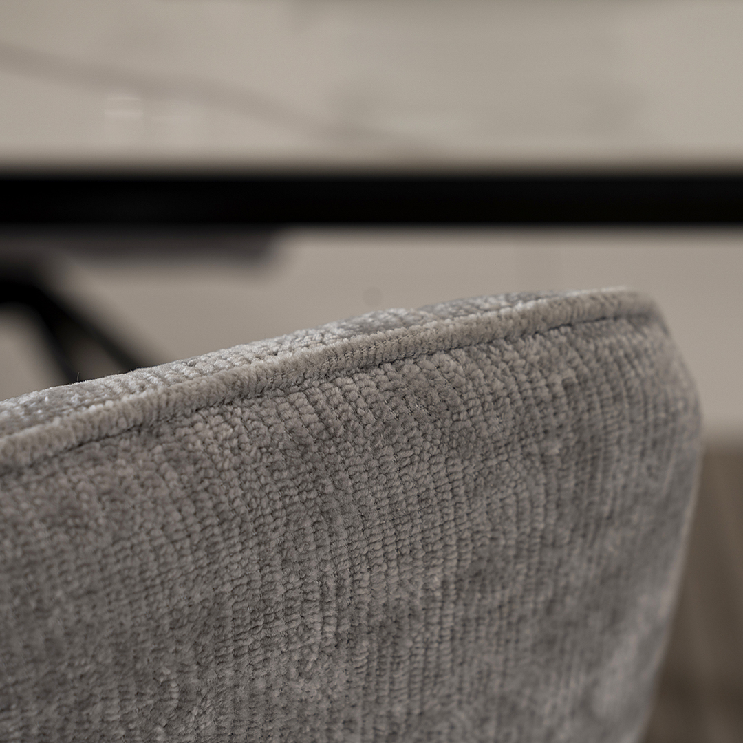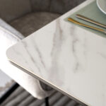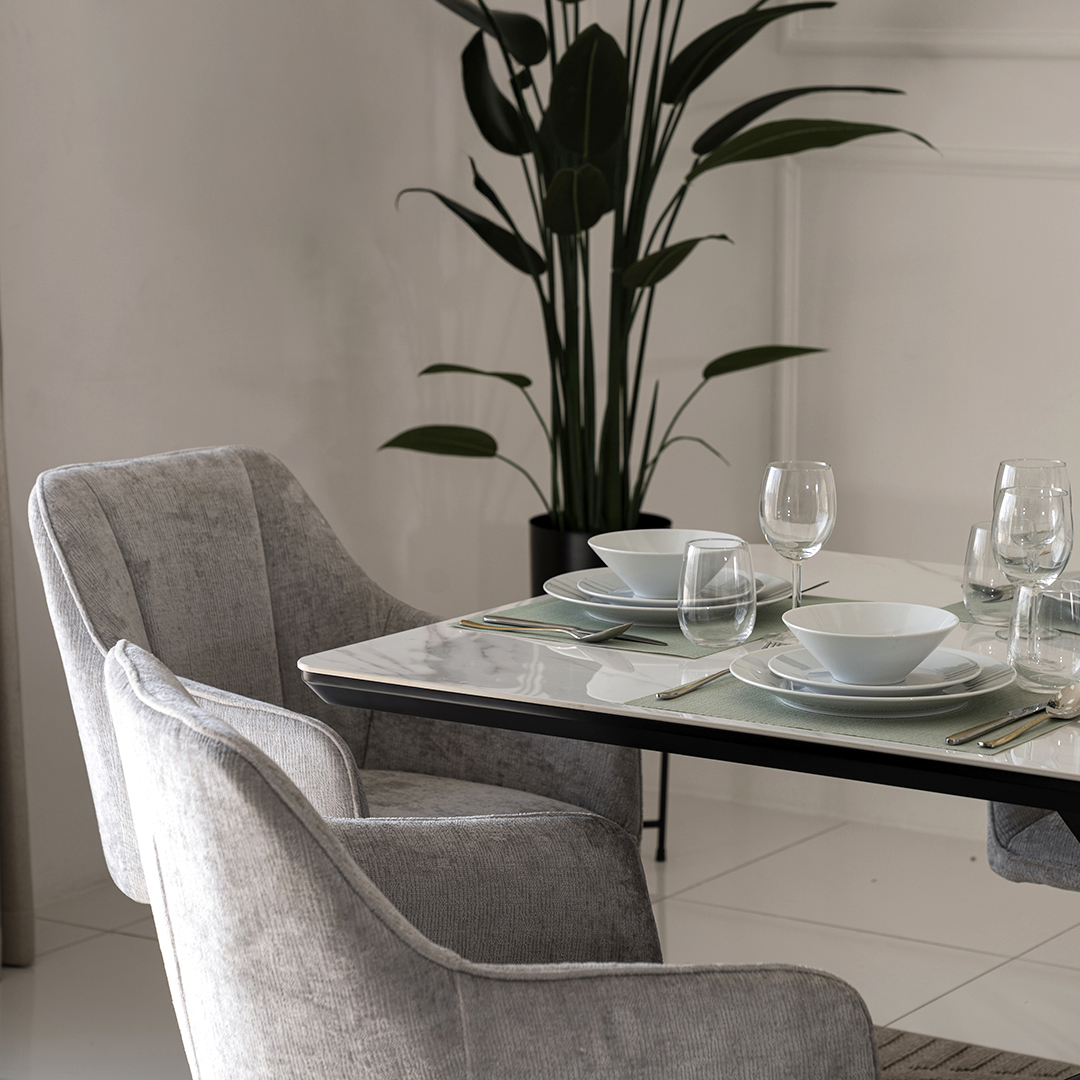 The Florence Dining Set combines sleek modern materials and a sophisticated color scheme, perfect for contemporary dining spaces. The table features a luxurious sintered stone tabletop, which is known for its durability, heat resistance, and easy-to-clean surface.
