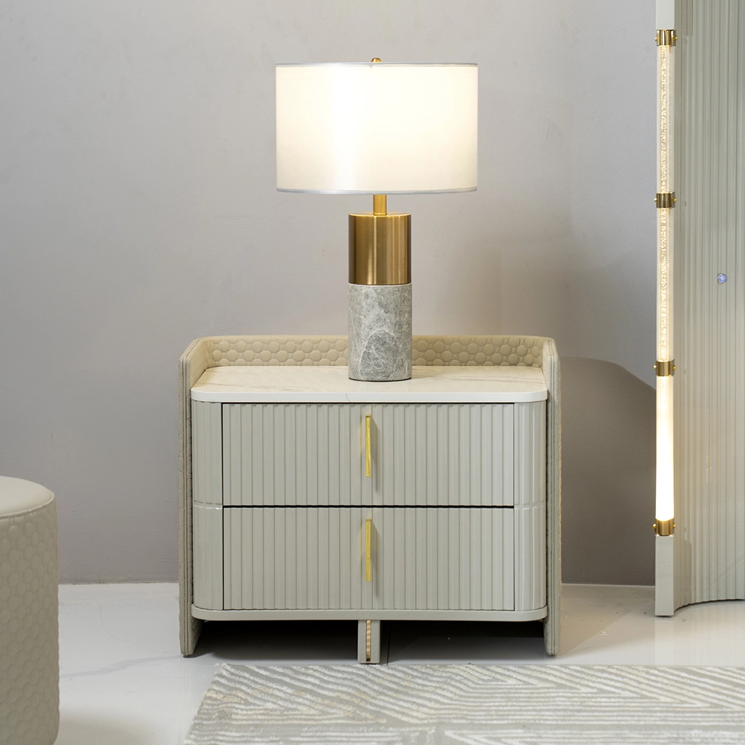 A contemporary luxury bedroom set featuring rich dark finishes and warm accents, designed to create a serene, sophisticated space with modern functionality.