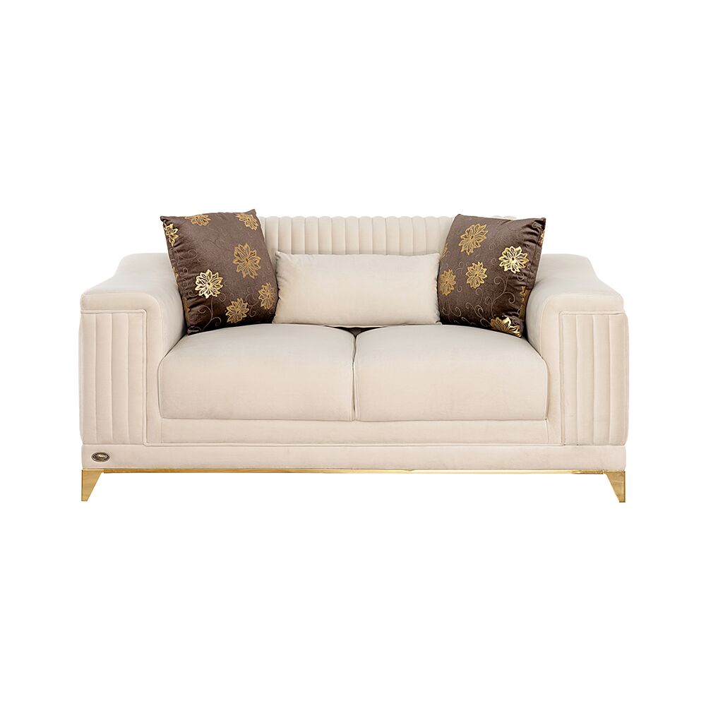 Presenting the Giselle 2-Seater Sofa, meticulously crafted with a frame featuring Beach and White Wood, robust MDF, and adorned in premium fabric upholstery.