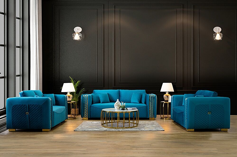 Discover opulent comfort with the Guild 7-Seater Sofa Set, adorned in the finest fabric upholstery and distinguished by its elegant metal gold legs.