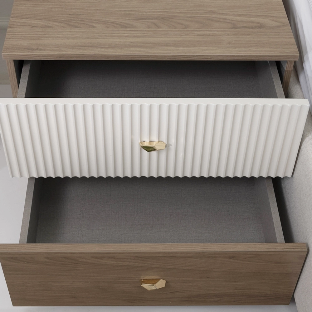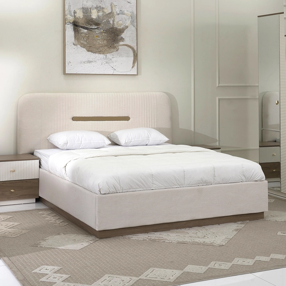Create a serene and stylish retreat with this modern bedroom set, designed to bring warmth, comfort, and refined simplicity into your space. Featuring a soft neutral upholstered bed paired with natural wood tones, this set blends contemporary elegance with everyday functionality.