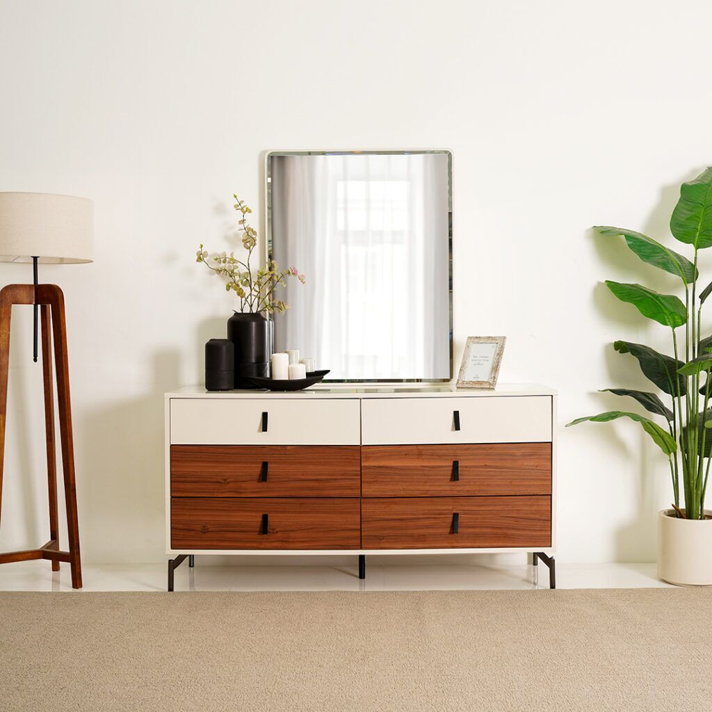 Add functionality and elegance to your bedroom with the Kaspar Dresser Mirror with Stool, a perfect blend of style and practicality. Crafted from Melamine Laminated MDF with a durable melamine finish, this dresser set is built to last while adding a touch of sophistication to your space.