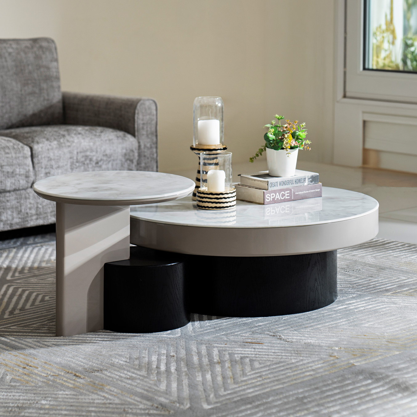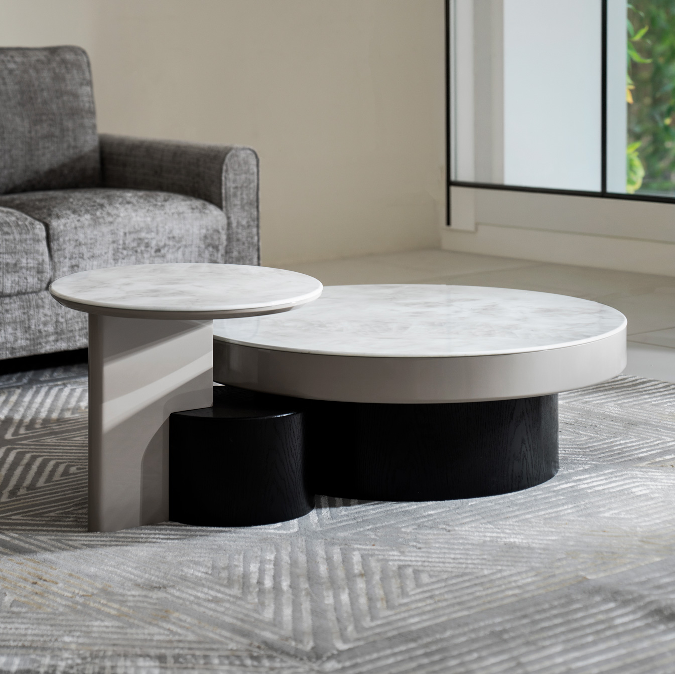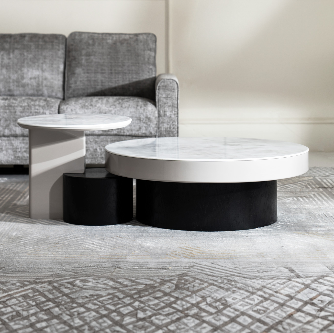An elegant 2-piece set featuring a main coffee table and a matching side table, perfect for flexible living space arrangements.