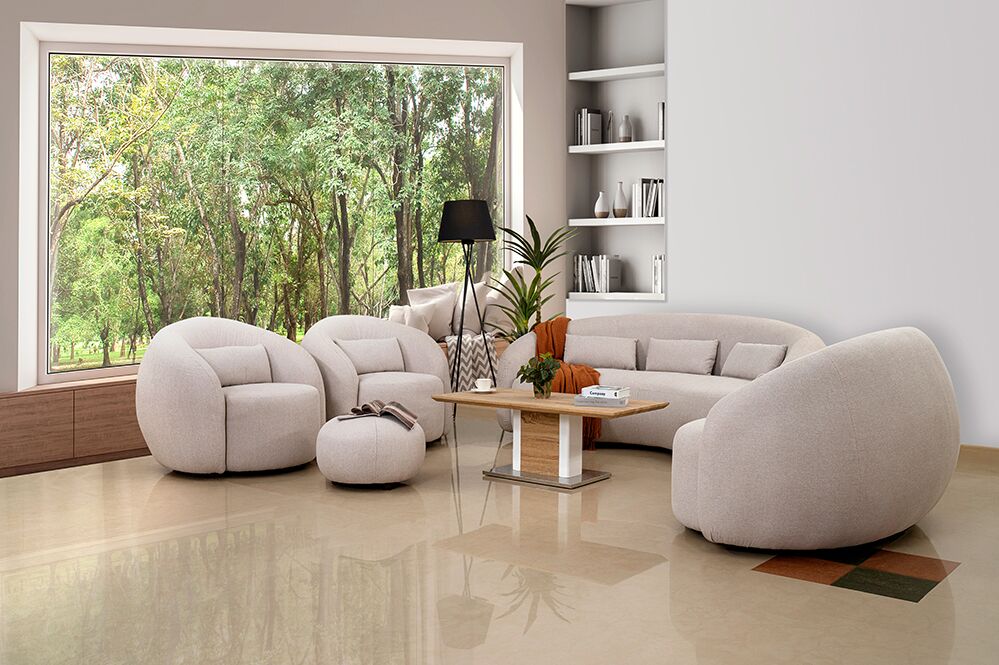 Introducing the extraordinary Kite Sofa Set with Ottoman, the set comprises a generously sized three-seater sofa, two-seater sofa and two cozy armchairs, and a complementary ottoman, each element meticulously crafted to ensure an optimal seating experience.