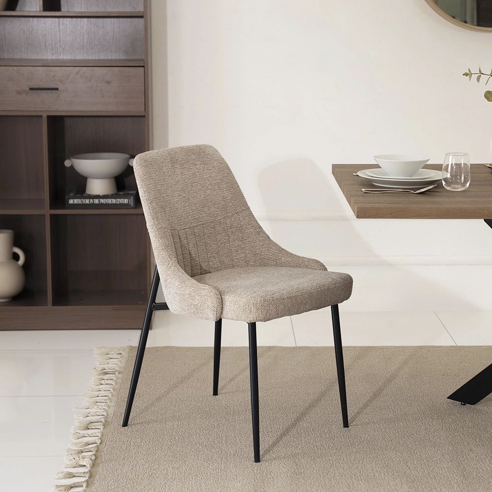 Elevate your dining space with the KJC Dining Chair, where the combination of fabric and metal, along with the option for color choice, creates a personalized and inviting ambiance.