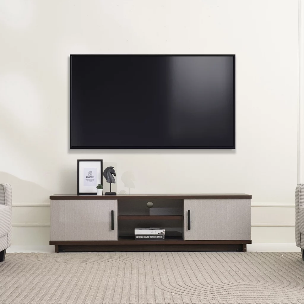 A sleek and modern TV unit featuring smooth curved edges and ample storage, designed to complement contemporary living spaces with both style and function.