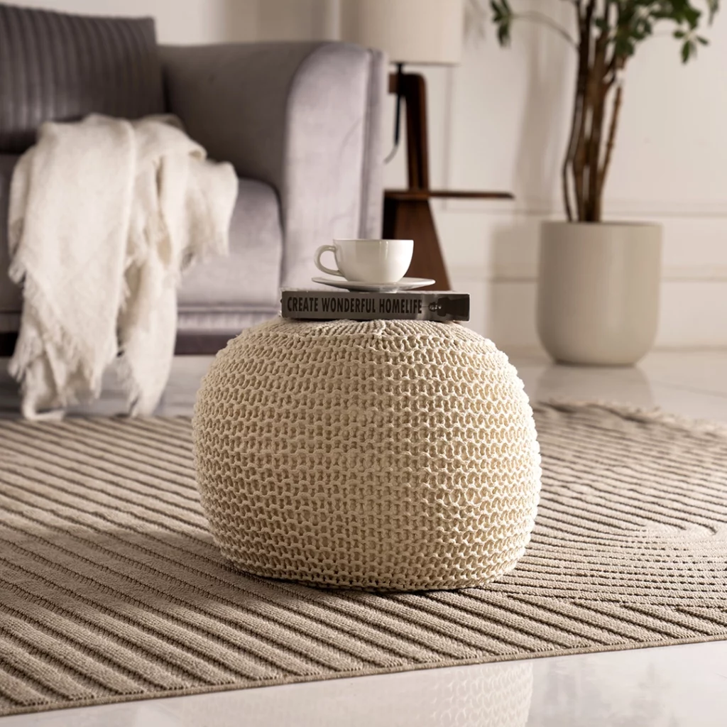 A stylish and versatile accent piece featuring a soft knitted texture. Perfect as extra seating, a footrest, or a decorative touch to complement any living space.