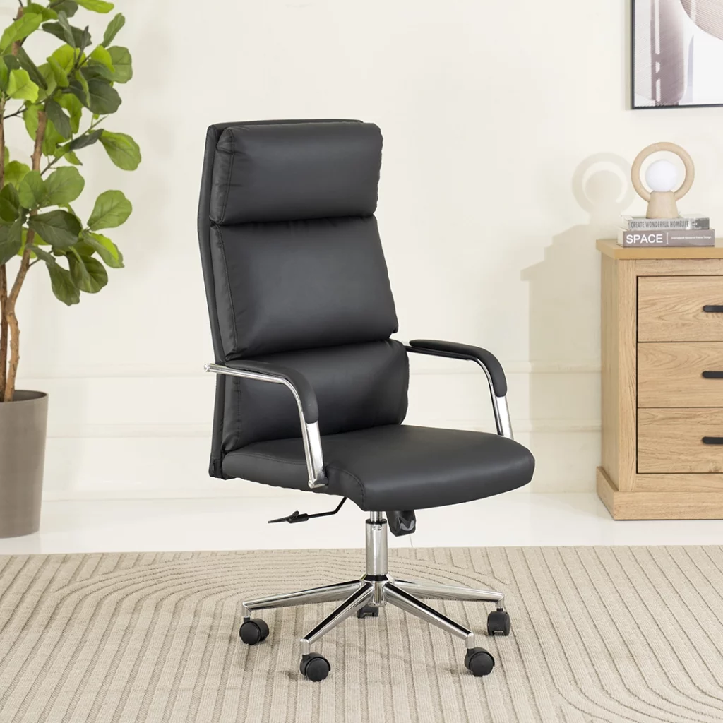 The Liya High Back Office Chair in black offers a sleek, modern design with a comfortable padded seat and supportive backrest—ideal for office reception areas, meeting rooms, or home workspaces.