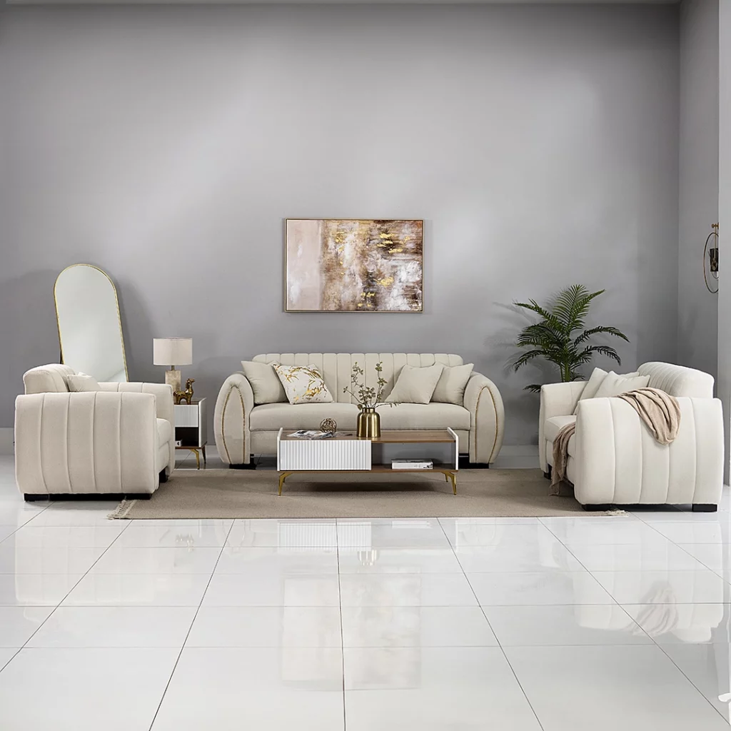 Introducing the exquisite Lucia sofa set, a true embodiment of elegance and comfort. The plush cushions are upholstered in sumptuous, cotton fabric that feels heavenly to the touch.