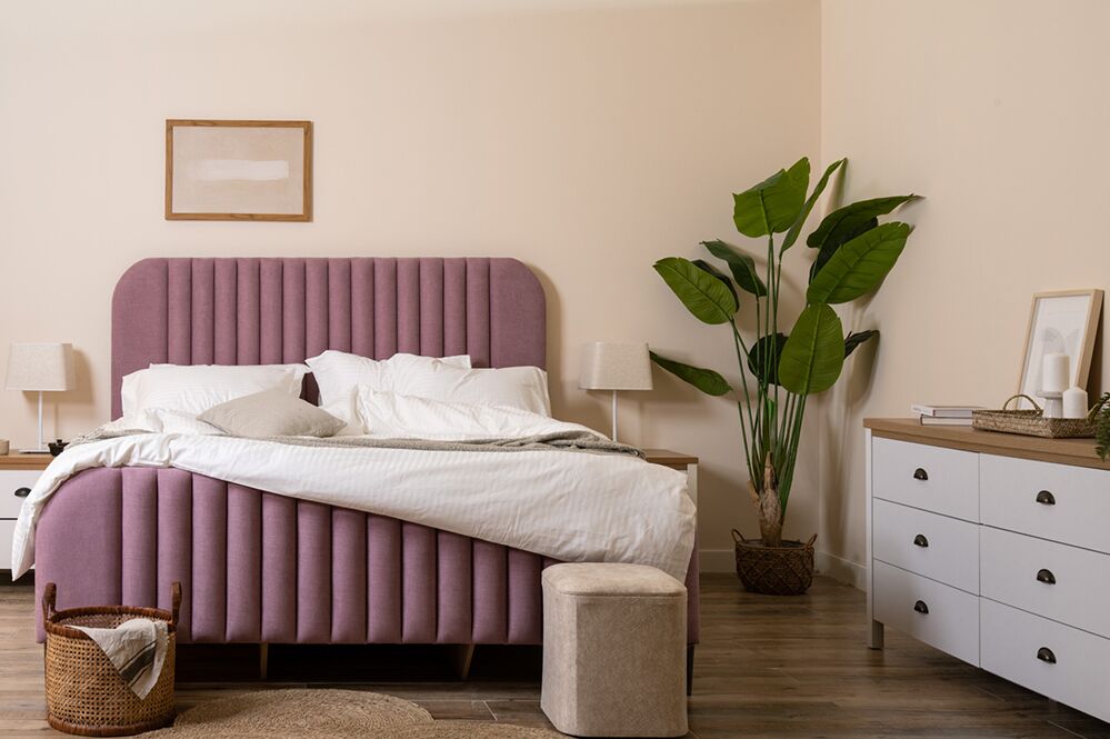 Elevate your bedroom with this stylish and inviting bed, where modern design seamlessly blends with the plush appeal of fabric.