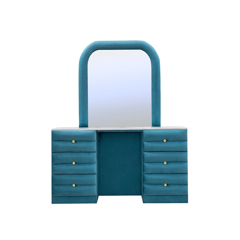 Immerse yourself in the opulent comfort and upscale design of the Mario Dresser with Mirror, where fabric, solid wood, and marble material finishes converge to create a statement piece for your bedroom. With spacious drawers for storage, the Dresser offers both style and functionality