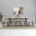 Built with a sturdy metal frame and sleek glass top, this dining set blends durability with modern style, while fabric-upholstered seats add comfort and elegance to every meal.