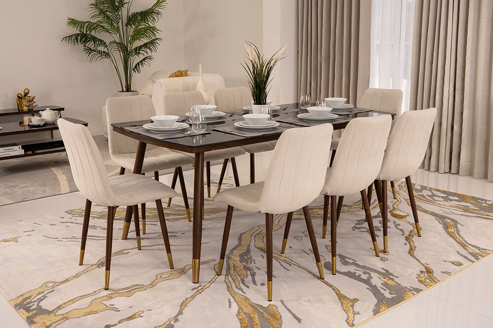 Elevate your dining area with the Metropolis Dining Set, where the fusion of Glass, Metal, Fabric, and a chic color palette creates a dining experience that is both visually striking and inviting.