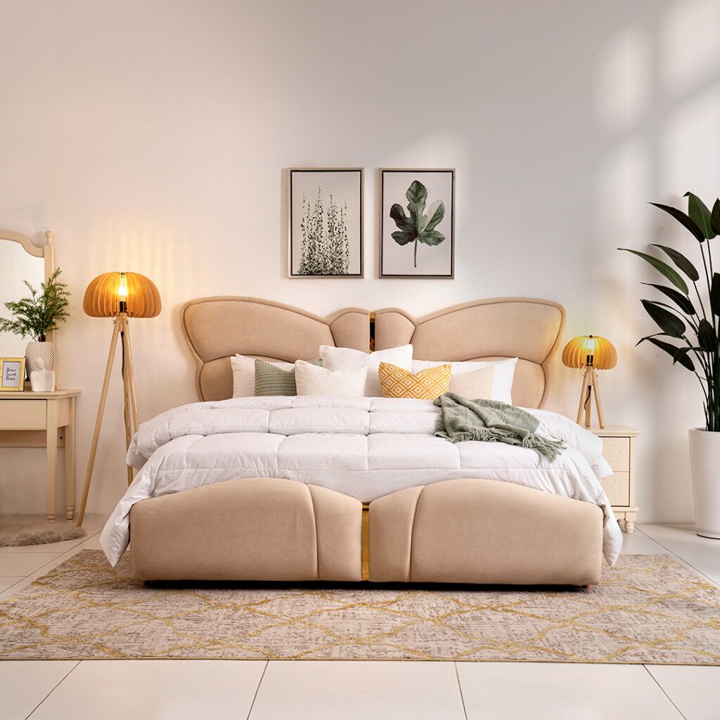 Experience luxurious comfort with the Monarch bed, crafted with the finest fabric material that exudes sophistication.The Monarch bed is a striking and imaginative piece of furniture inspired by the delicate shape of a butterfly. Its design features a unique, butterfly-wing silhouette that creates a dramatic and elegant focal point in any bedroom.