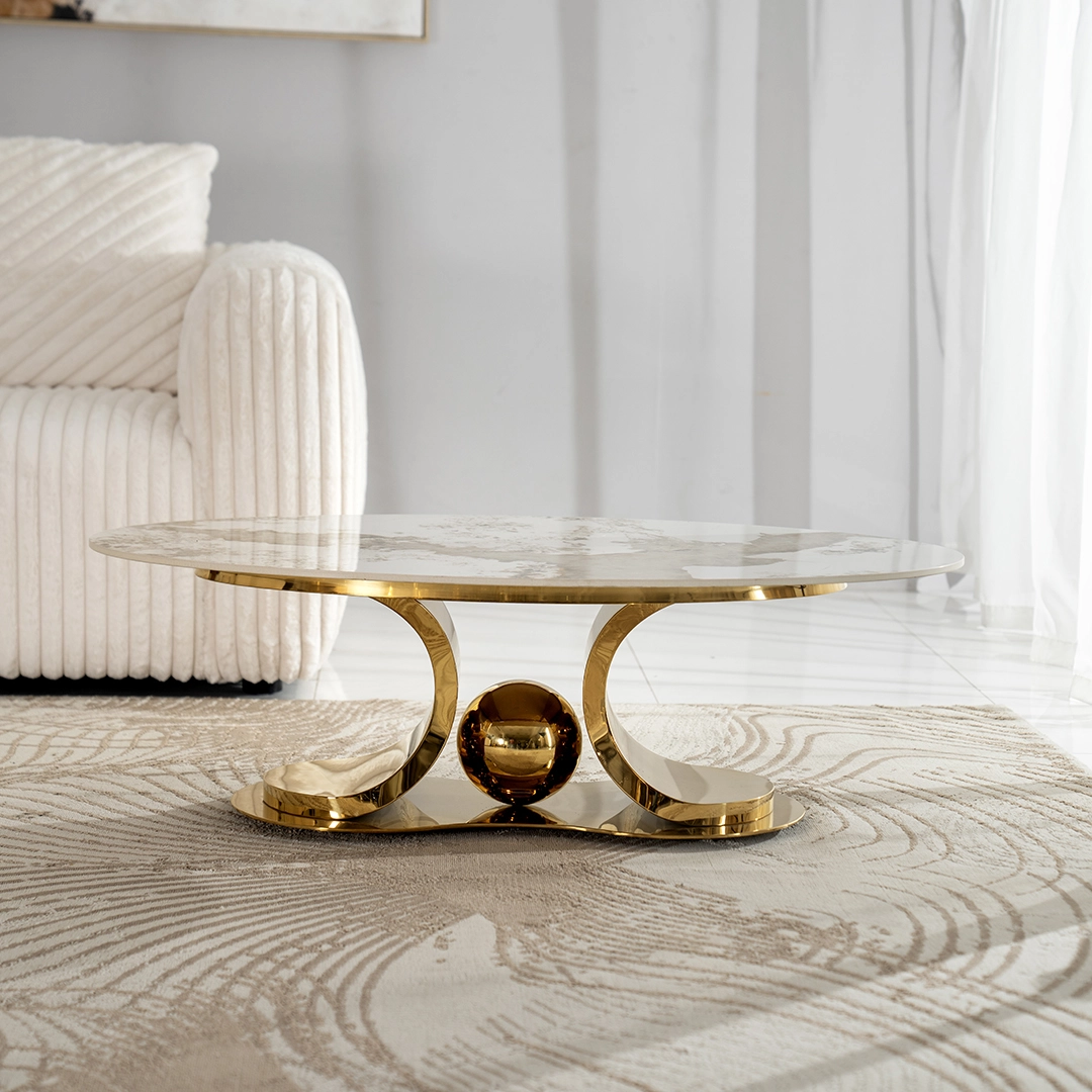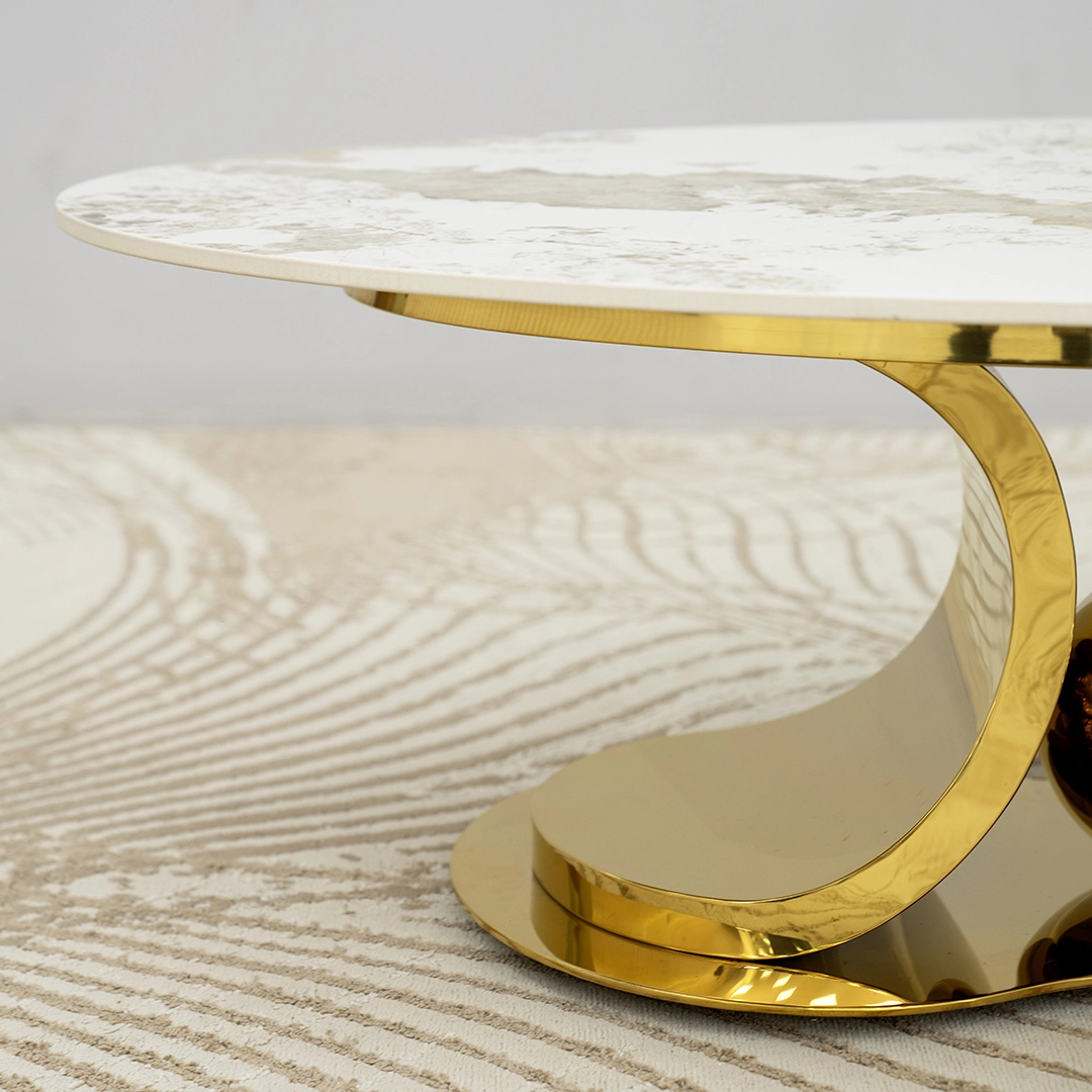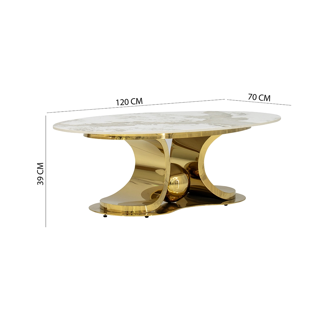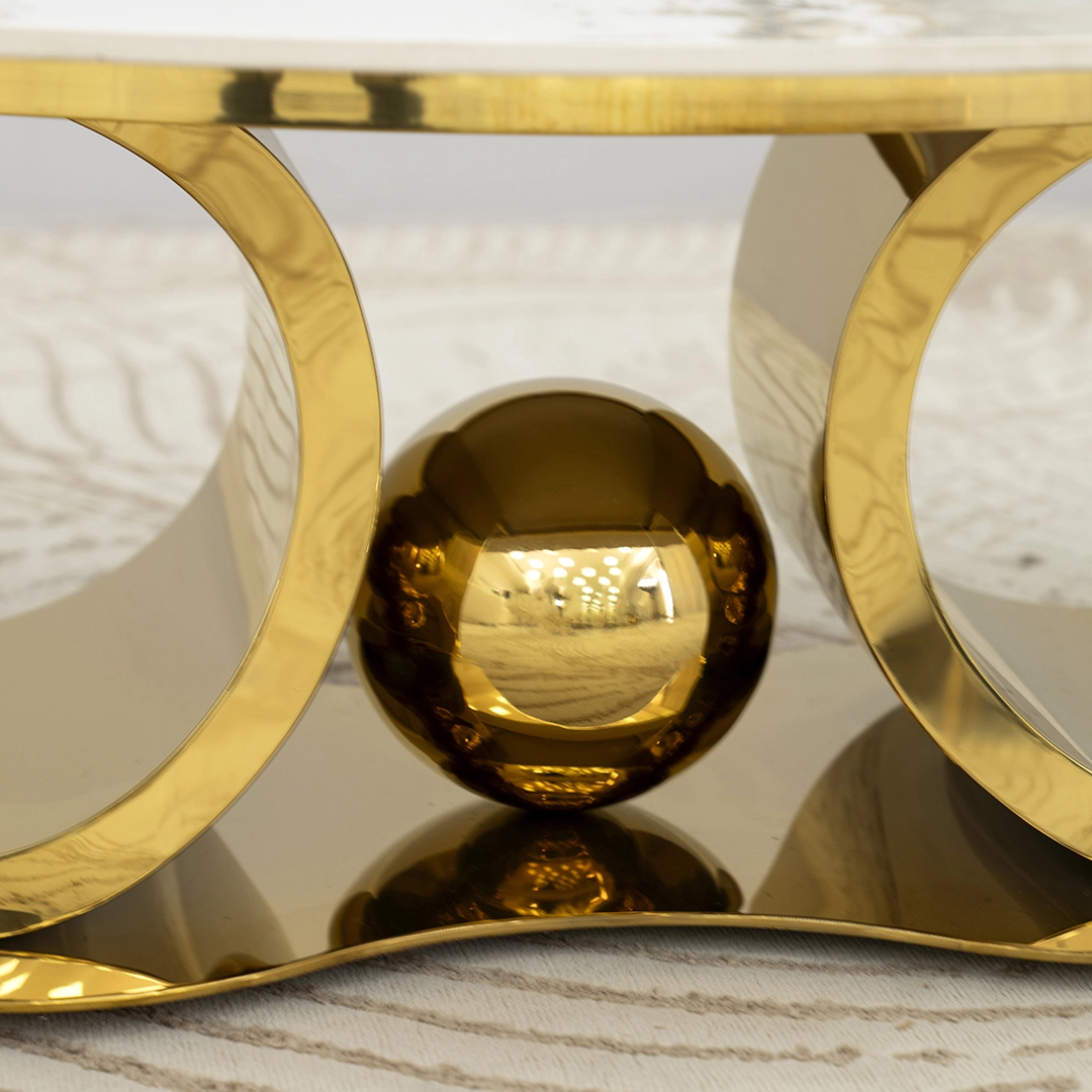 Beautiful two-tone design: a crisp white tabletop paired with a polished gold-metal base/legs, giving a luxurious, modern aesthetic.