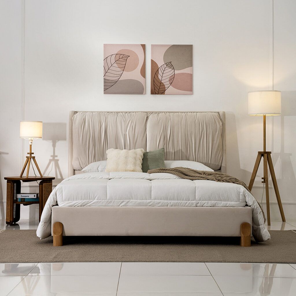 The Naboodah upholstered bed combines elegance and comfort, featuring a luxuriously padded frame and a smooth fabric finish, adding sophistication to any bedroom.
