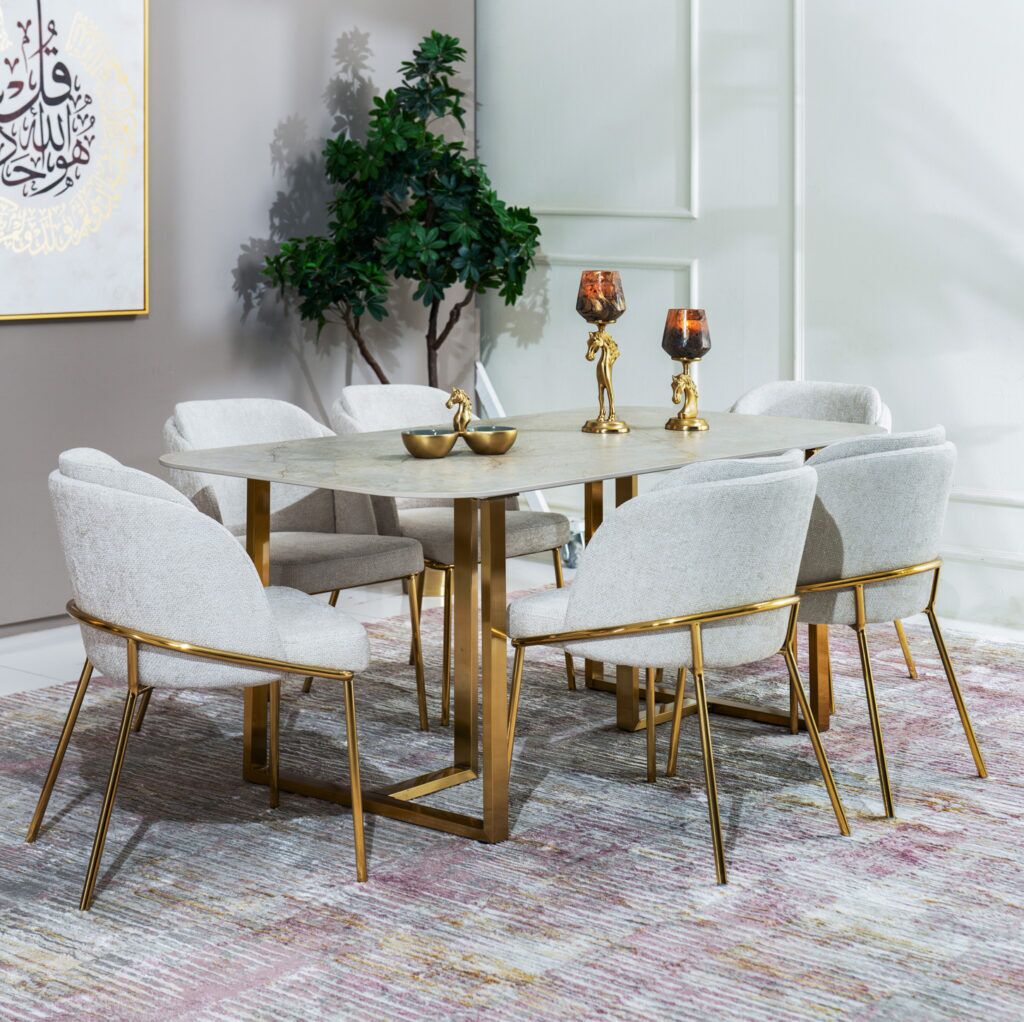 Finished with a sleek Matte Glossy finish, the set is highlighted in a timeless Grey & Gold color palette, adding a sense of brightness and refinement to your home. The spacious table provides ample room for meals and gatherings, while the upholstered fabric chairs ensure comfort and style for your guests.
