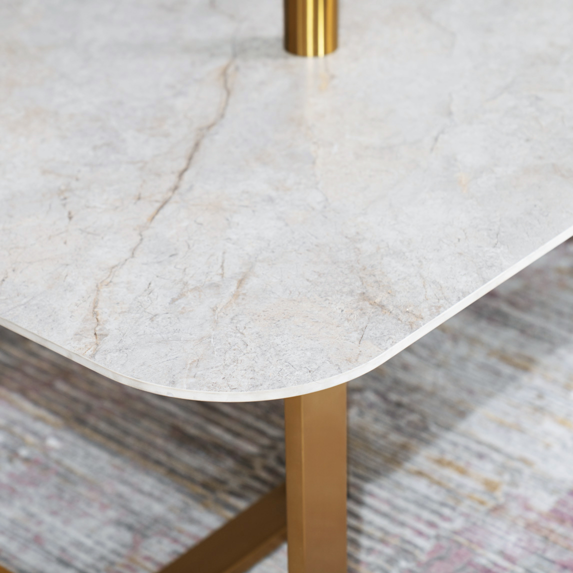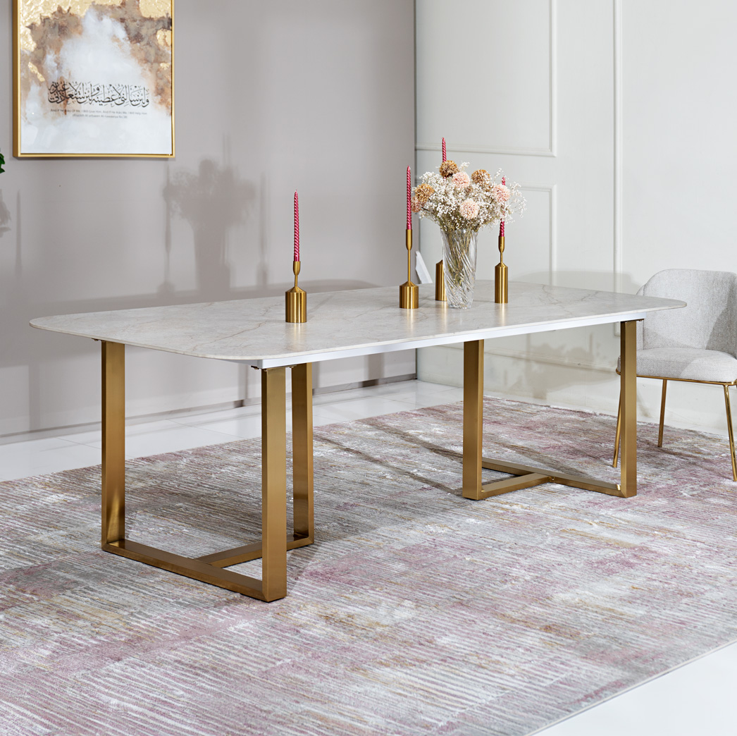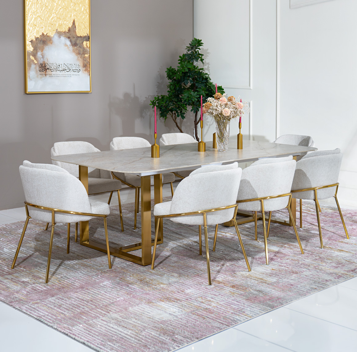 Finished with a sleek Matte Glossy finish, the set is highlighted in a timeless Grey & Gold color palette, adding a sense of brightness and refinement to your home. The spacious table provides ample room for meals and gatherings, while the upholstered fabric chairs ensure comfort and style for your guests.