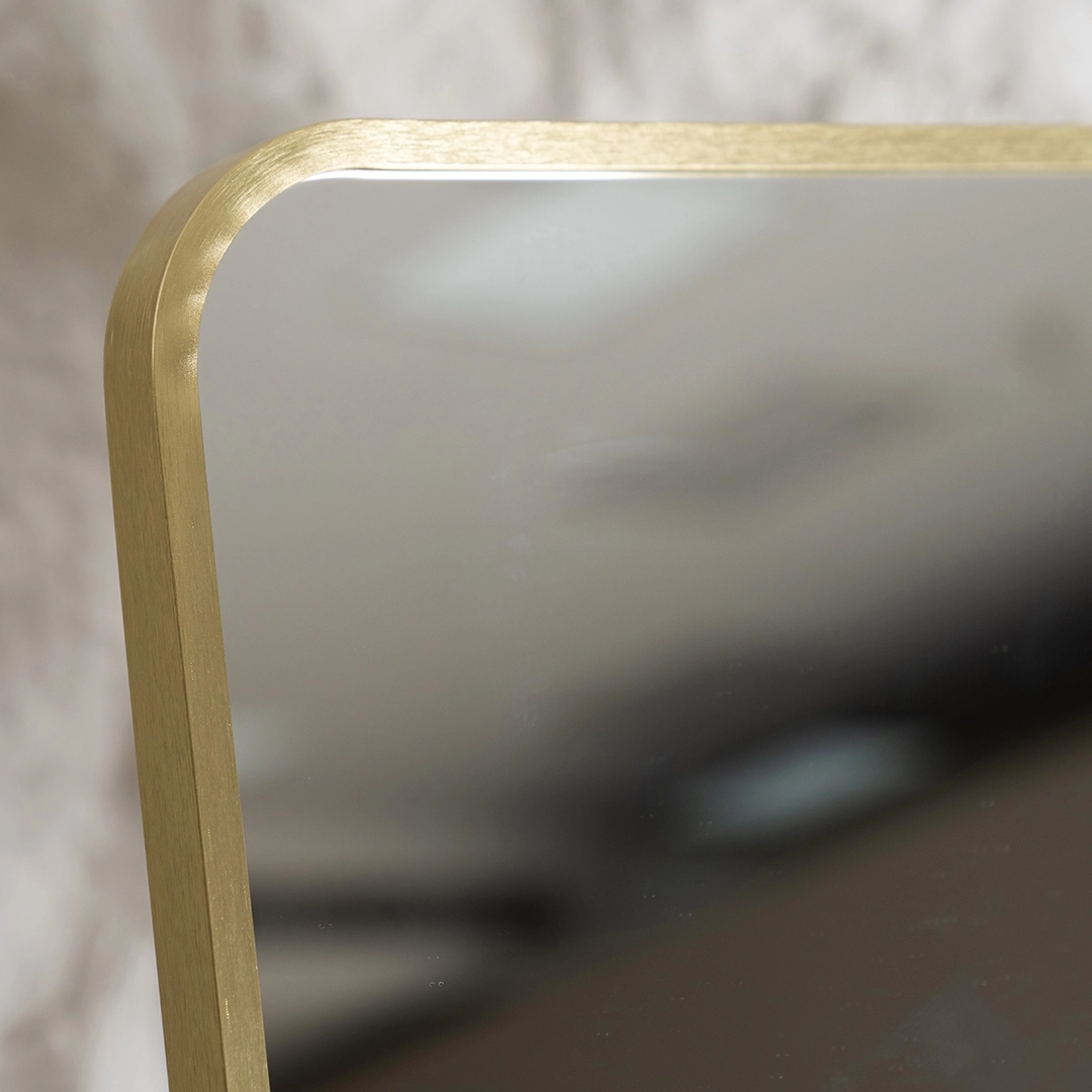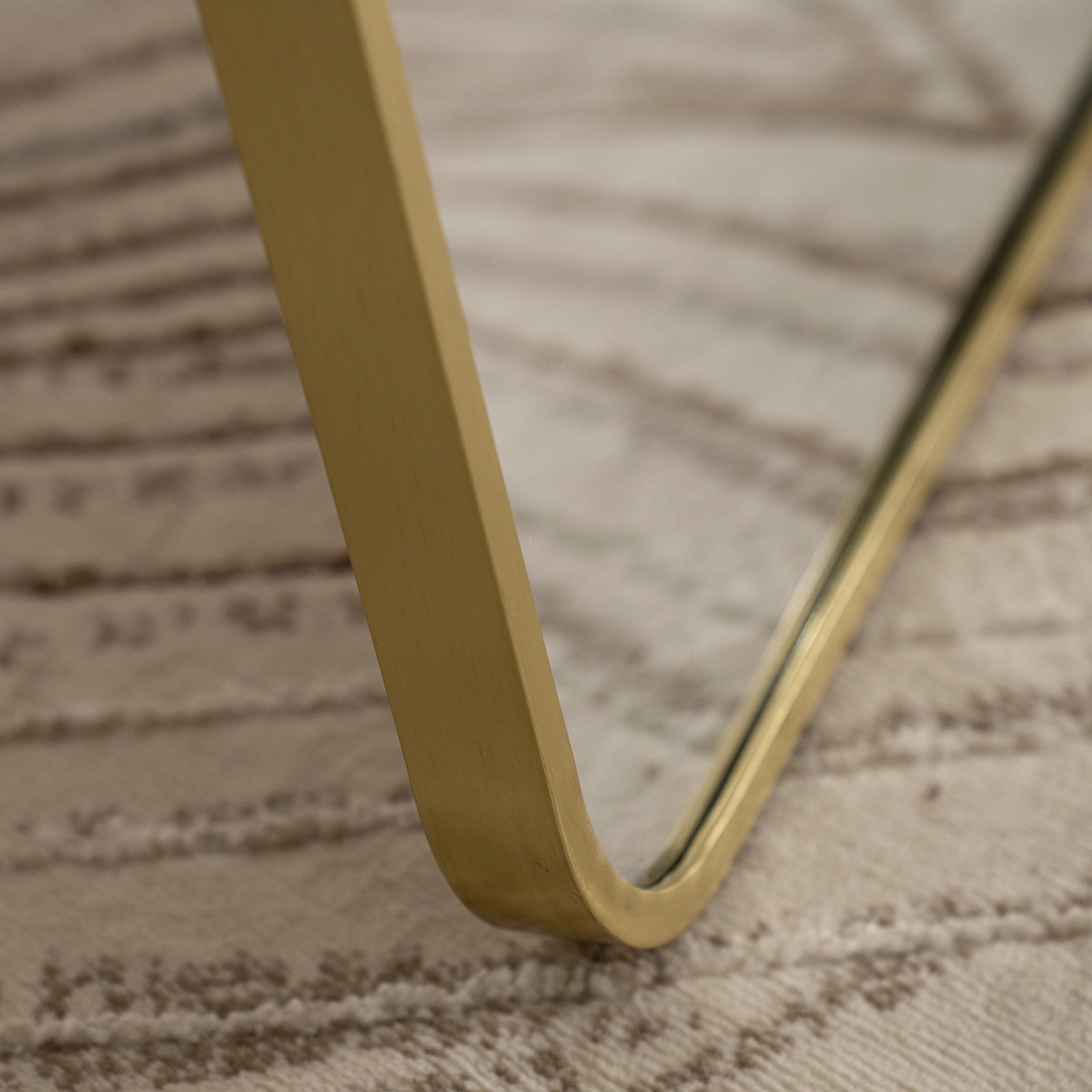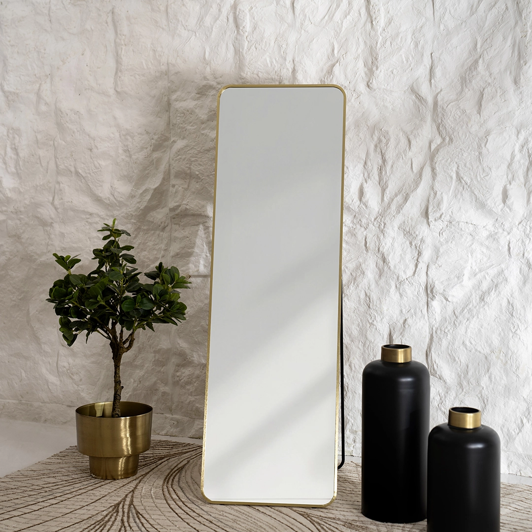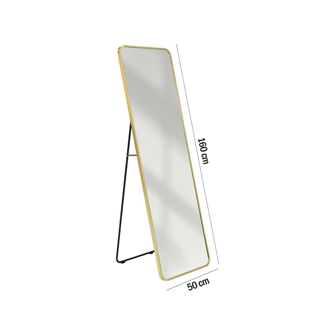 The Nexa Metal Standing Mirror in gold features a sleek and modern design, with dimensions of Perfect for any contemporary space, this full-length mirror offers both style and functionality, ideal for use in bedrooms, entryways, or dressing areas.
