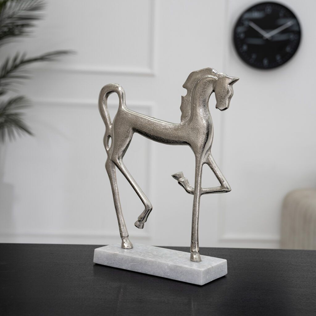 The Orline Nickel Cantering Horse Accent features a sleek contemporary design with a nickel finish and a sturdy marble base, adding modern elegance to any space.