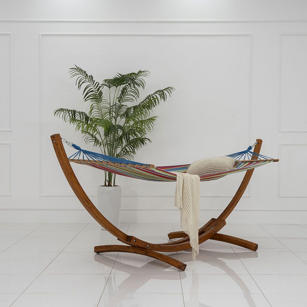 . The wooden frame usually includes spreader bars at each end, keeping the hammock bed open and creating a spacious, flat surface for lounging.