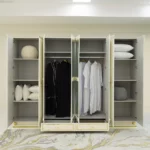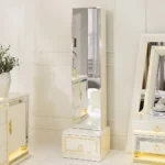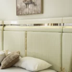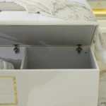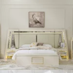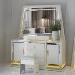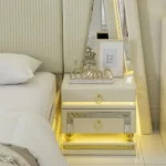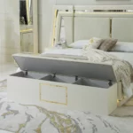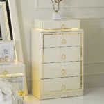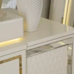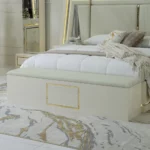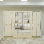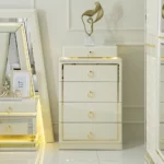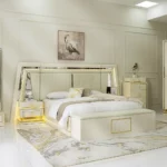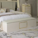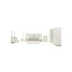 Add a touch of luxury to your bedroom with the prizma set. Featuring a 200×180 cm bed, spacious 8-drawer dresser, chest of drawers, bench, and full-length mirror, this collection blends functionality with elegant cream and gold accents for a refined, sophisticated look.