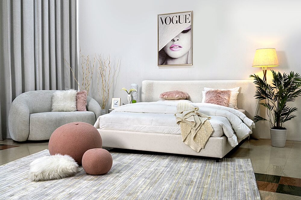 Transform your bedroom with this chic and luxurious bed, where modern design seamlessly merges with the sumptuous texture of premium fabric and the timeless charm of wooden legs.