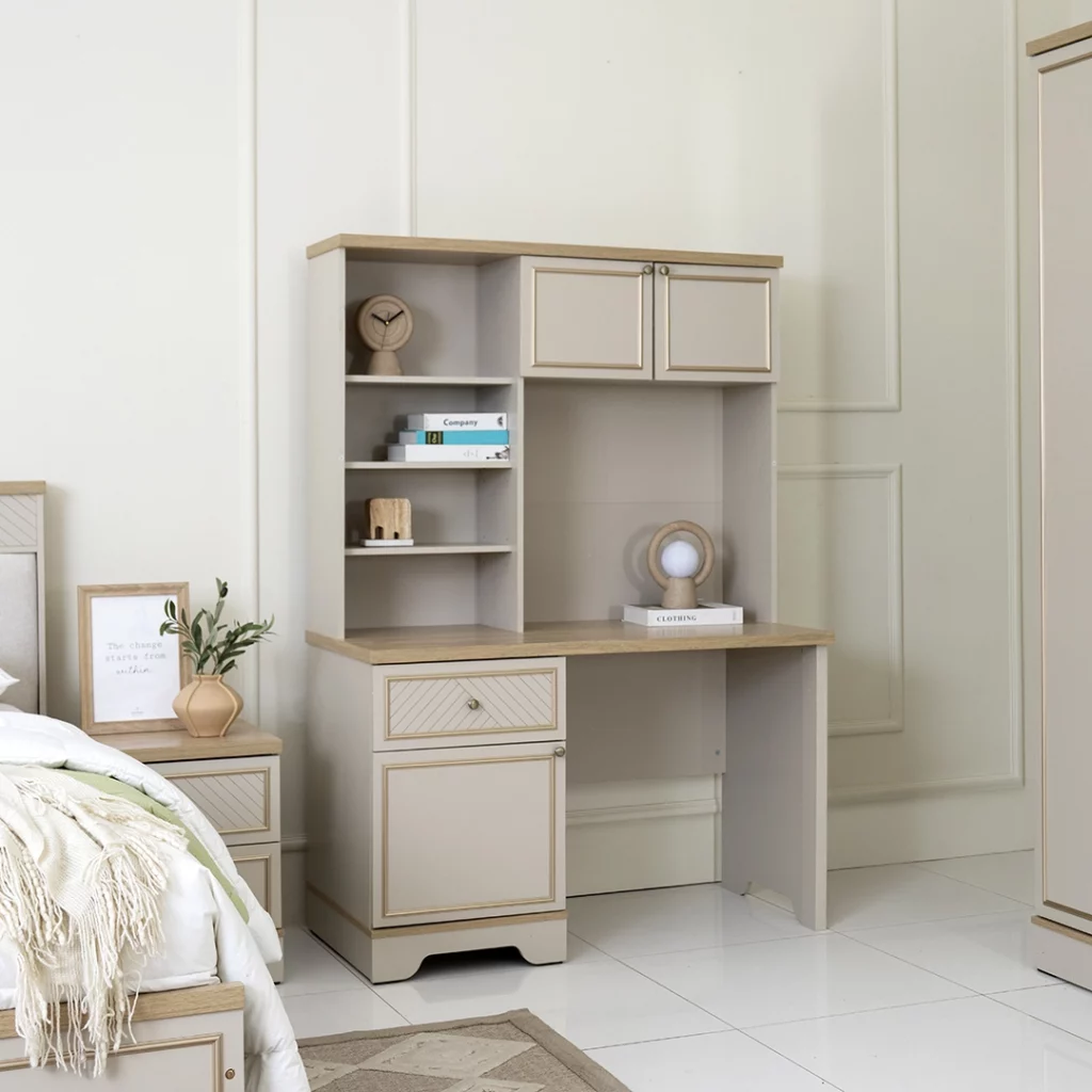 This study table combines modern simplicity with practical functionality. Its spacious work surface and sturdy construction make it ideal for studying, working, or organizing your essentials, fitting seamlessly into any home or office setting.