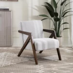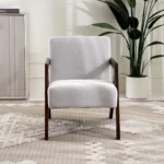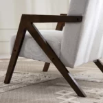 A stylish blend of comfort and charm, the Sarafina accent chair features a sleek silhouette upholstered in soft, durable fabric. Perfect for adding a touch of elegance to your living space while offering a cozy spot to relax.